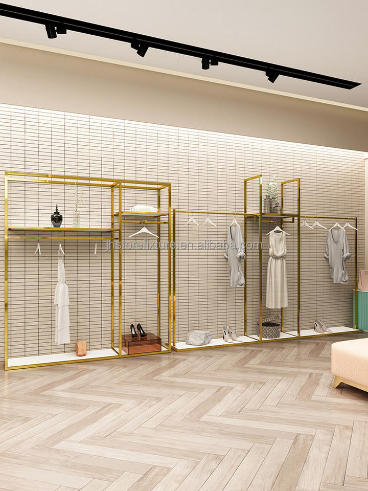Fabbrica di qualità oro lucido in acciaio inox personalizzare il Logo vestiti espositore per le donne vestito negozio di abbigliamento