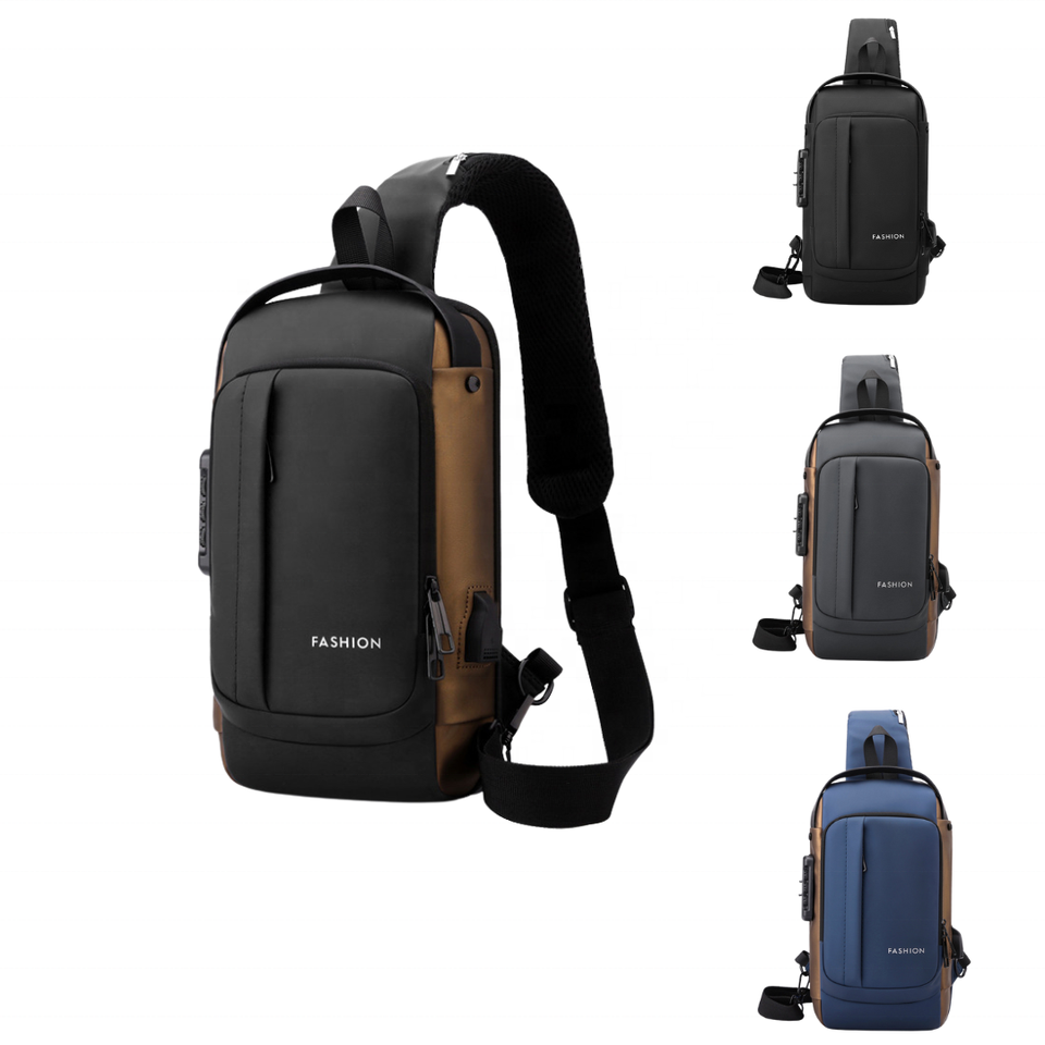 Quality Men's Chest Bag Password Lock Single Shoulder Black Backpack with USB Charger Moto Anti Theft Crossbody Sling Bag