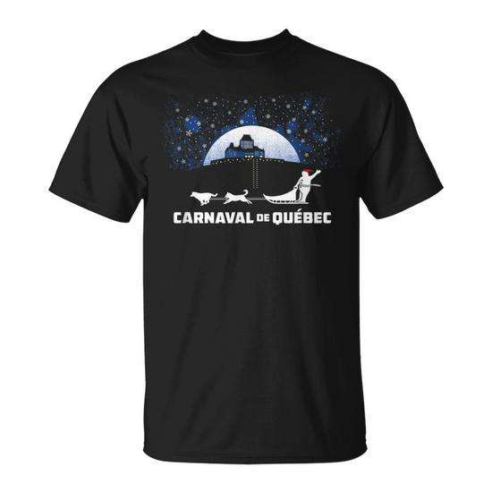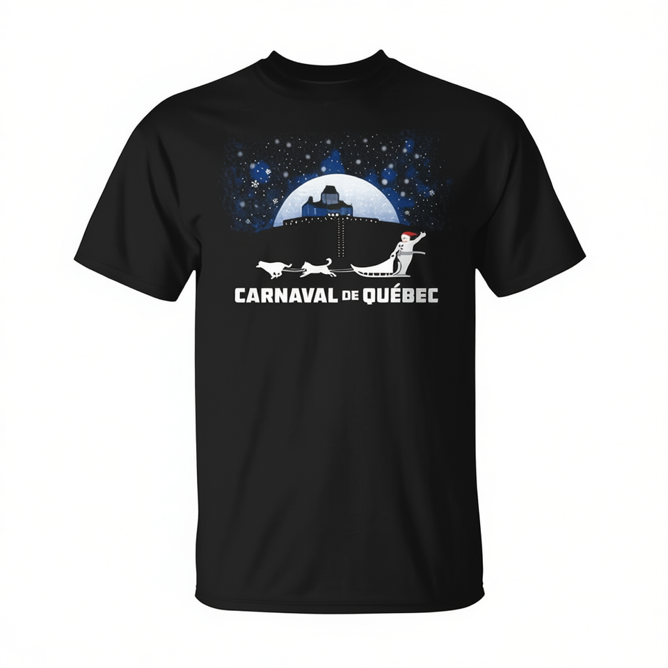 T-shirt Promozionale con Cane da Slitta del Carnevale Invernale del Quebec, Pupazzo di Neve con Cappello Rosso e Fascia