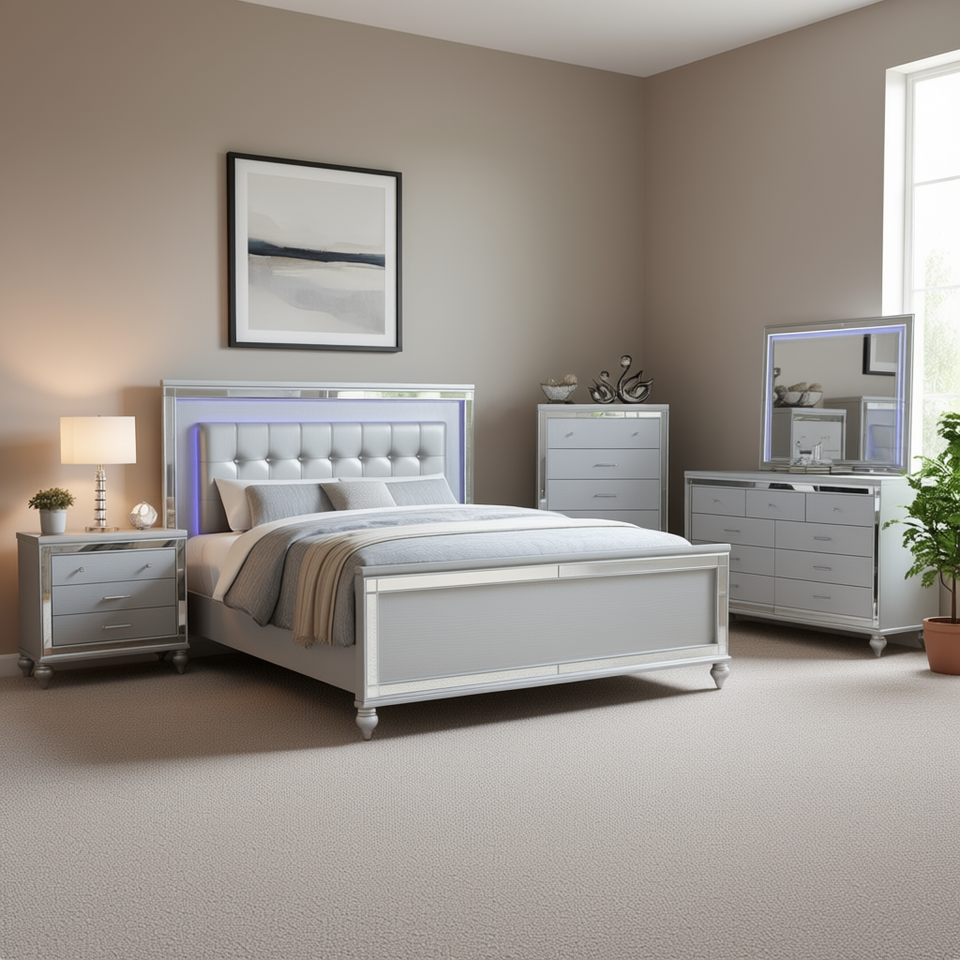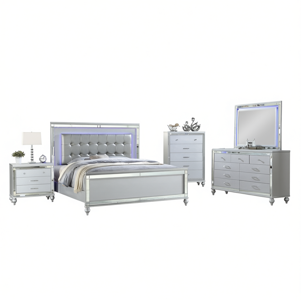Set Camera da Letto Sterling Queen in Legno Argento con LED, Comò, Specchio e Comodino - Design Moderno Contemporaneo