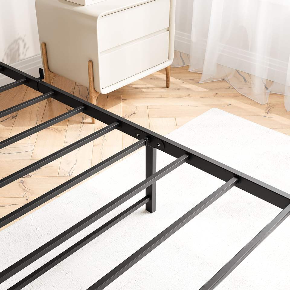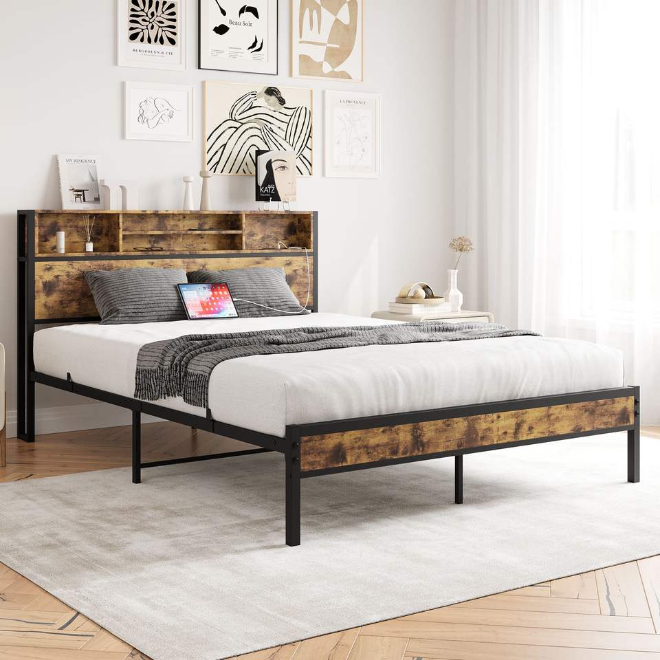 Letto Matrimoniale con Testiera Contenitore, Piattaforma in Metallo, Stazione di Ricarica, Facile Montaggio, Libreria Integrata, Nessun Box Spring Necessario