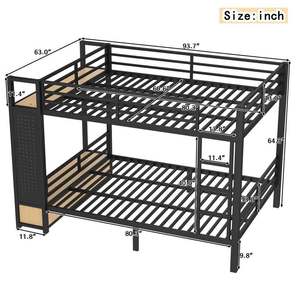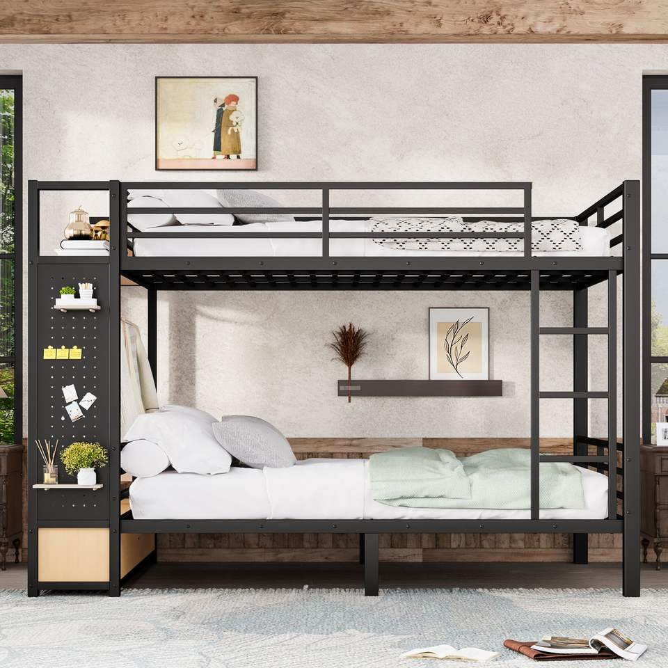 Letto a Castello in Metallo Queen Over Queen per Ragazzi con Ripiani Contenitori, Cassetti e Pannello Forato Nero - Ideale per Dormitorio