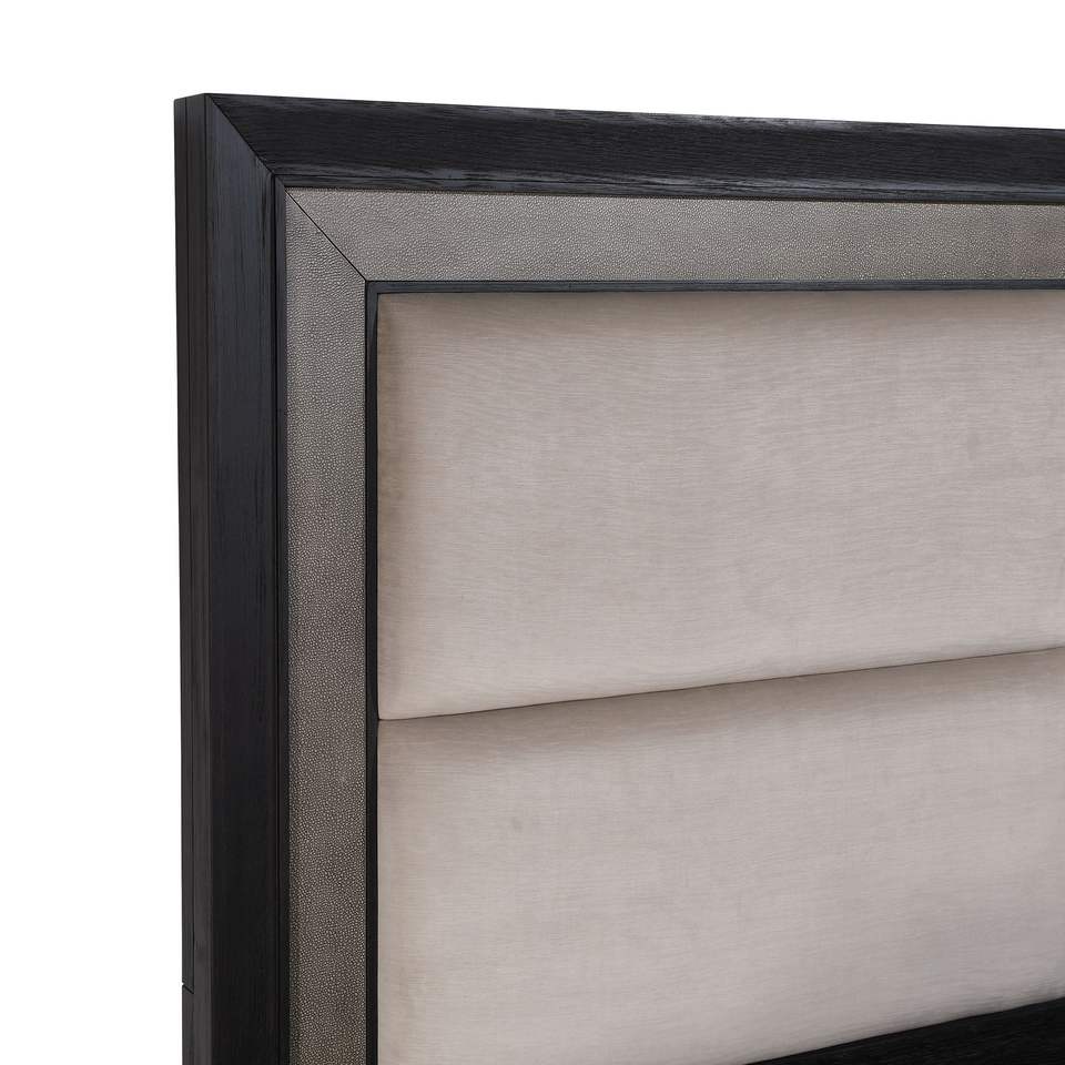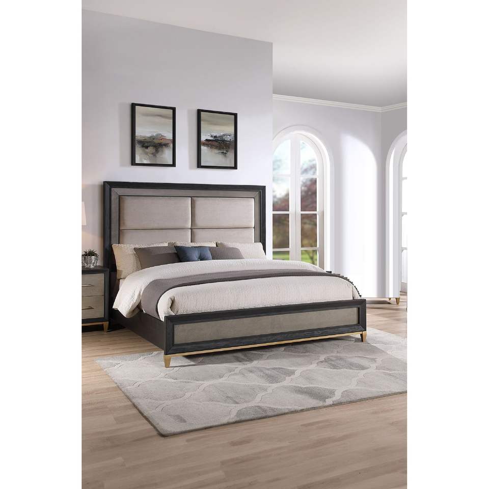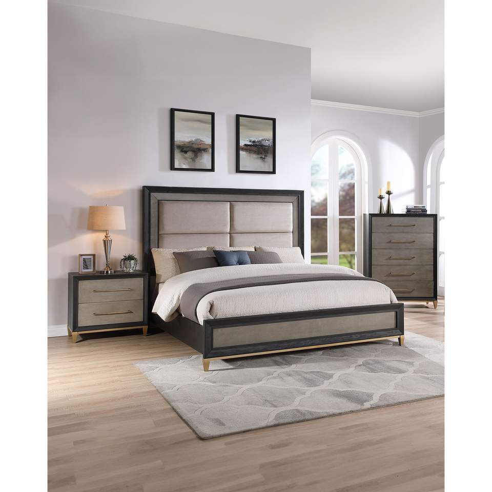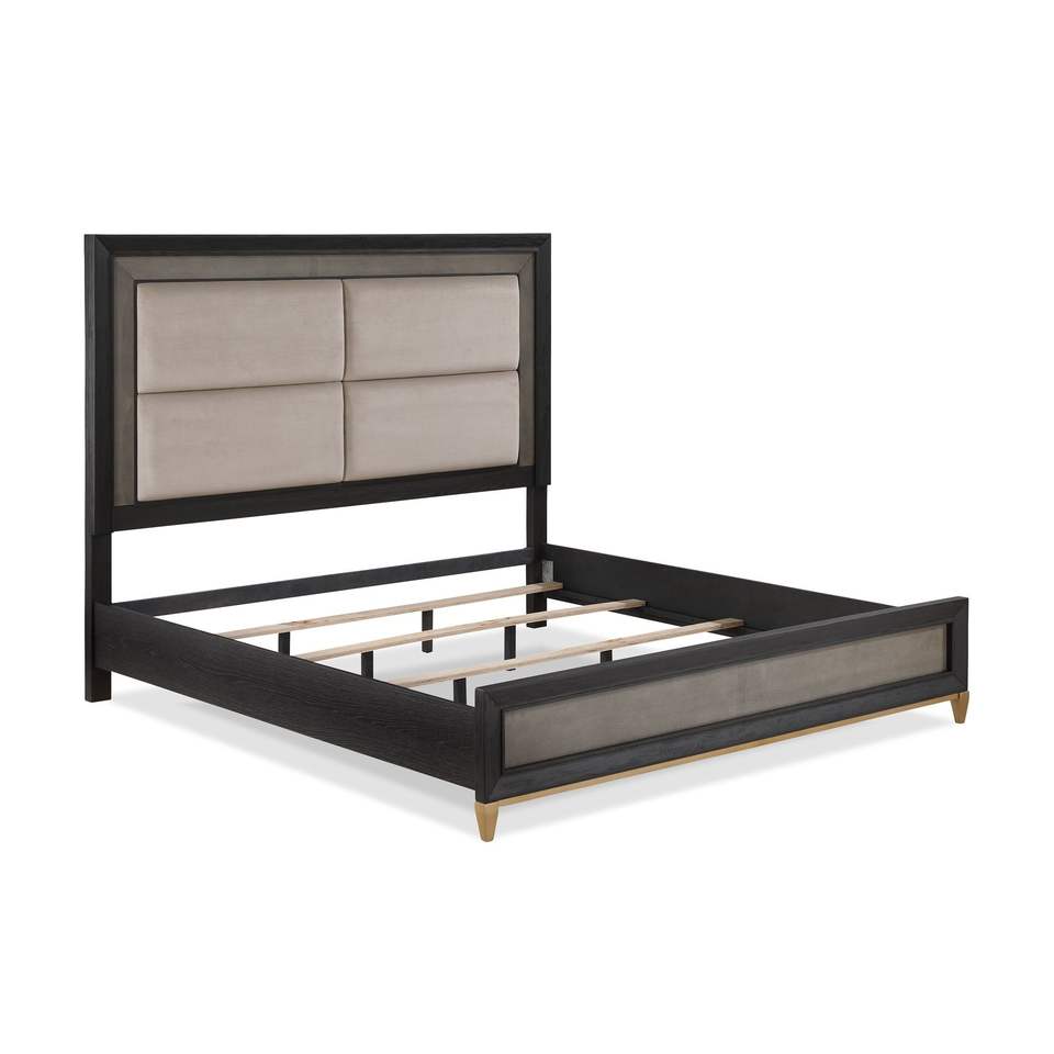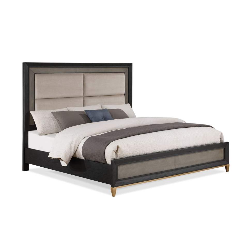 Letto matrimoniale Queen Size con pannello imbottito in legno massello, finitura nero-marrone e gambe dorate, mobili per camera da letto