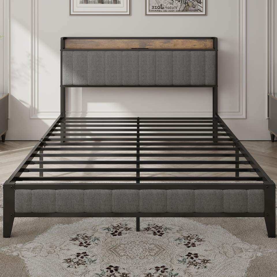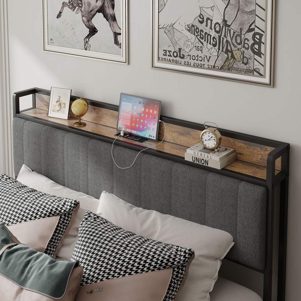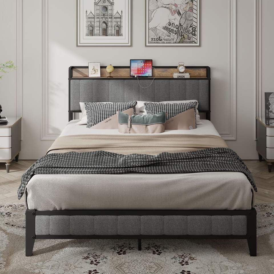 Struttura letto matrimoniale con piattaforma in metallo grigio, testiera imbottita e stazione di ricarica