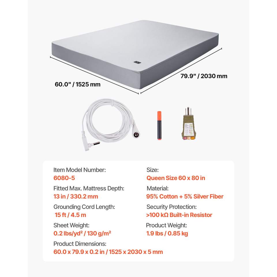 Lenzuola con Cavo di Messa a Terra Queen Size, 95% Cotone + 5% Fibra di Argento Puro, con Test di Messa a Terra