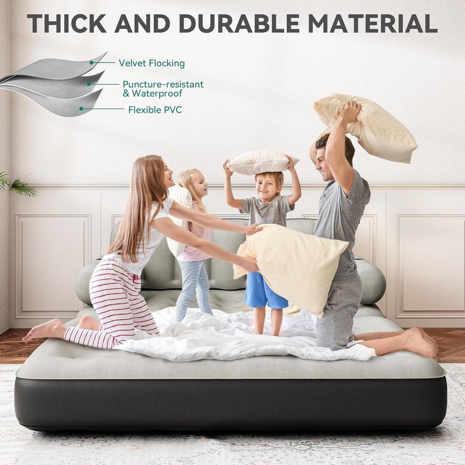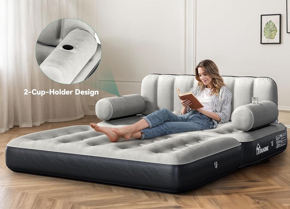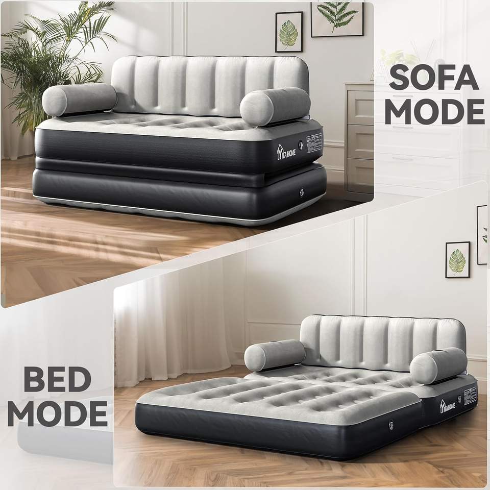 Divano Letto Gonfiabile Queen Size con Testiera e Pompa, Convertibile 2-in-1, Regolabile, Portatile, Nero, per Casa, Campeggio, Ospiti