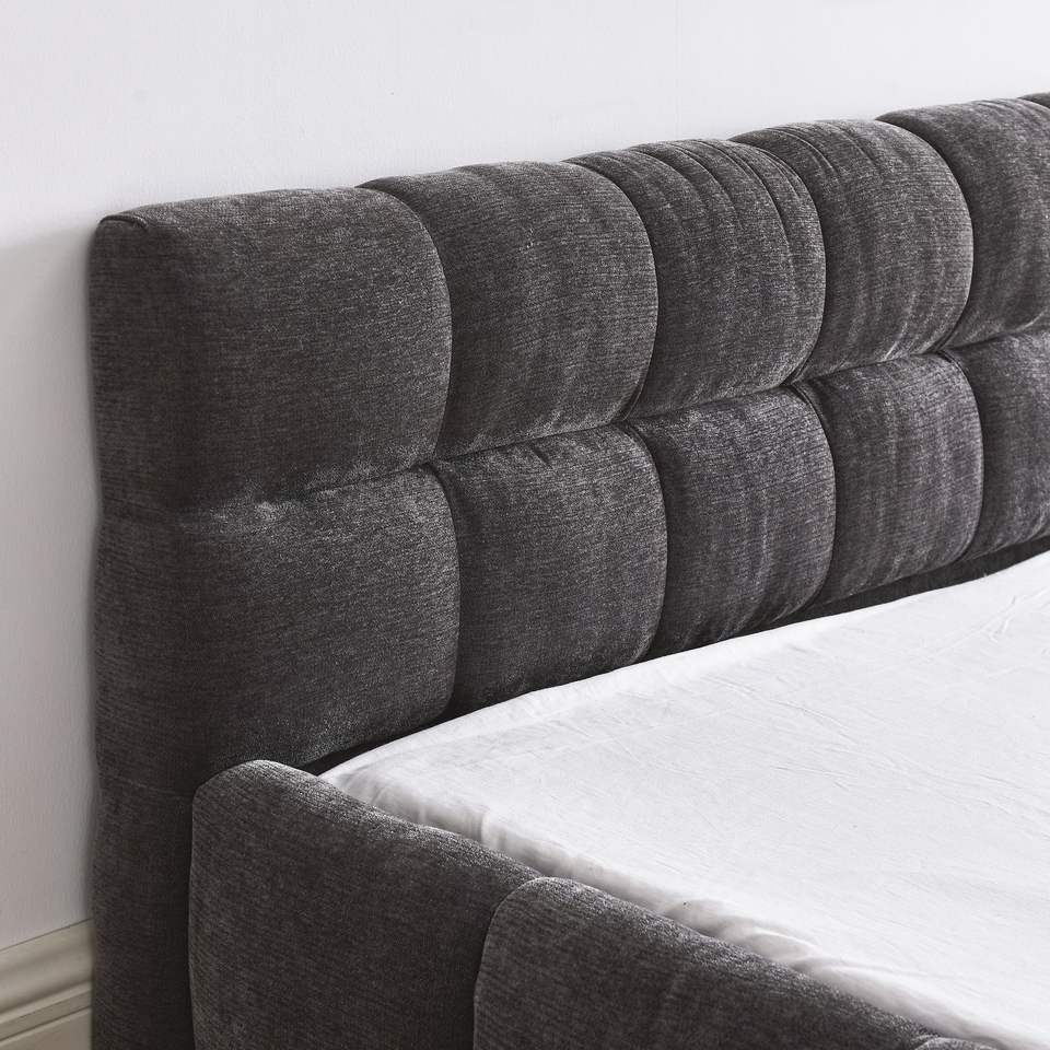 Letto matrimoniale imbottito con testiera in tessuto ciniglia spesso e piattaforma in legno massello