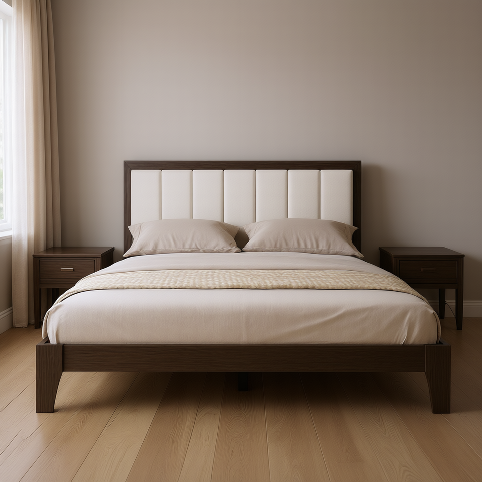 Letto matrimoniale moderno imbottito con testiera in tessuto e struttura in legno, design morbido