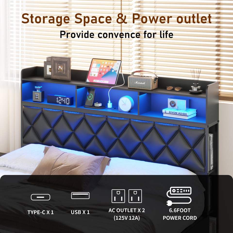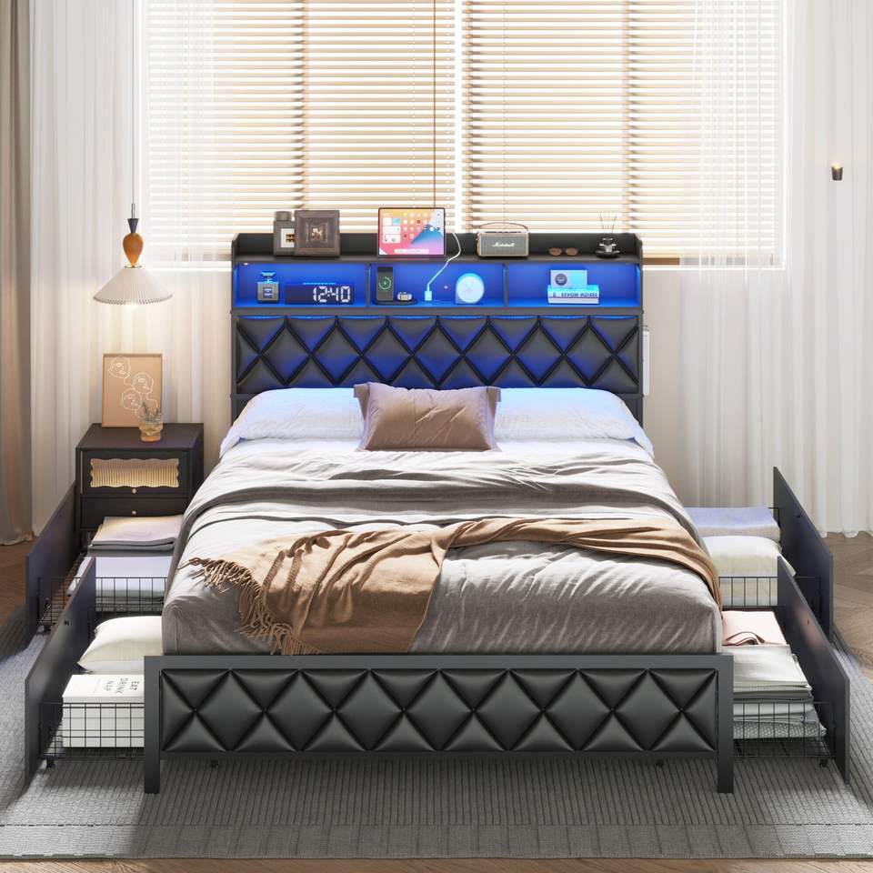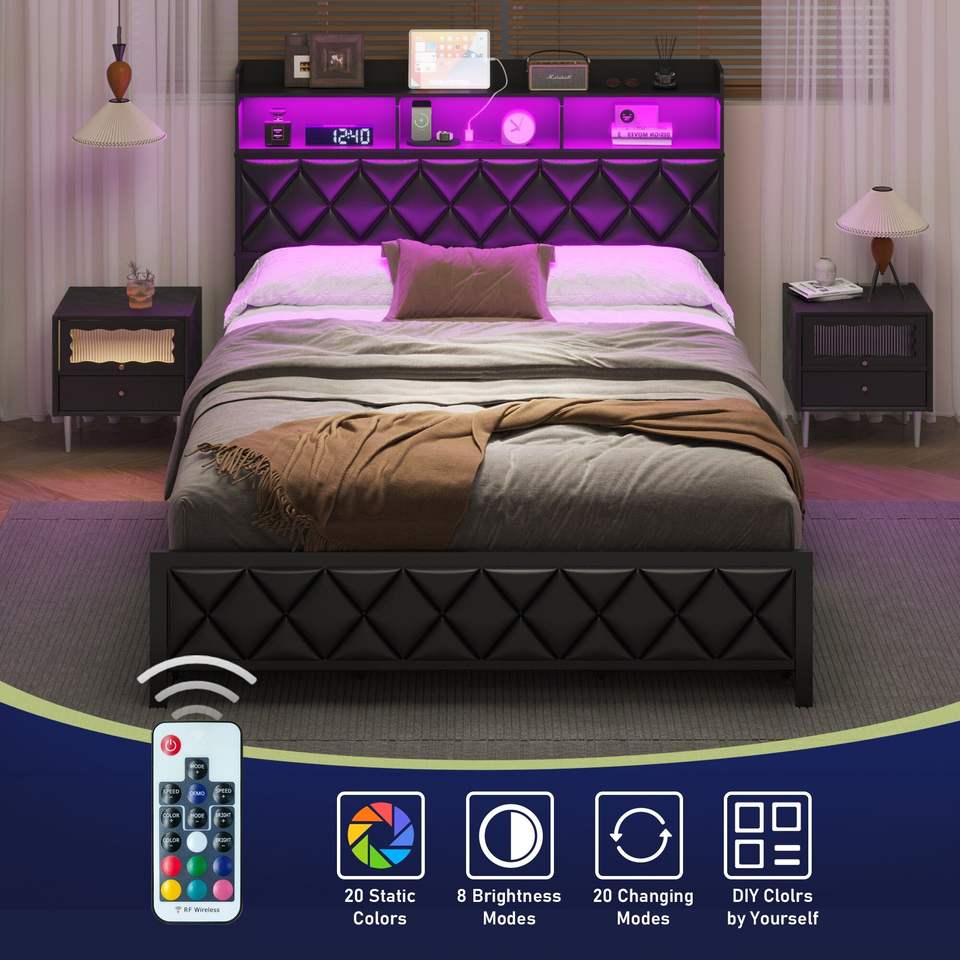 Letto matrimoniale imbottito con piattaforma, stazione di ricarica LED, testiera con 4 cassetti contenitore, struttura letto robusta con luce LED
