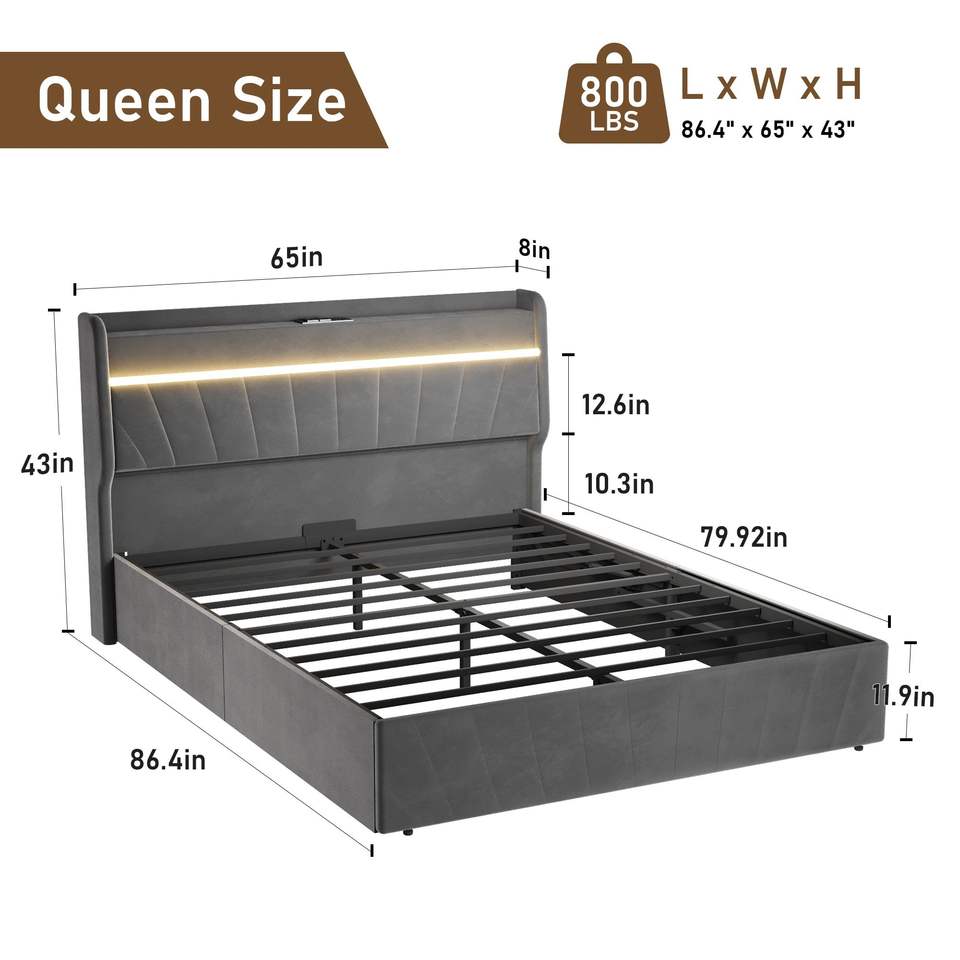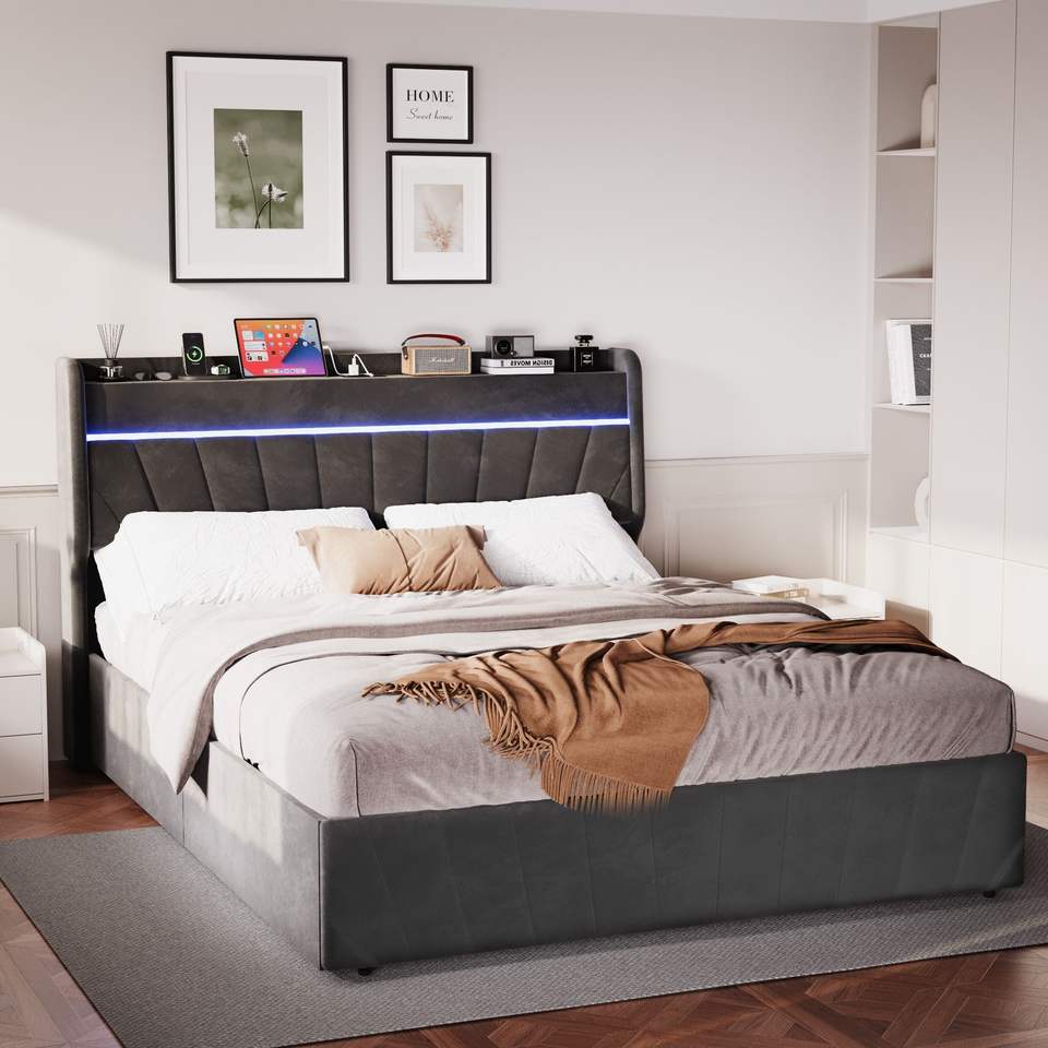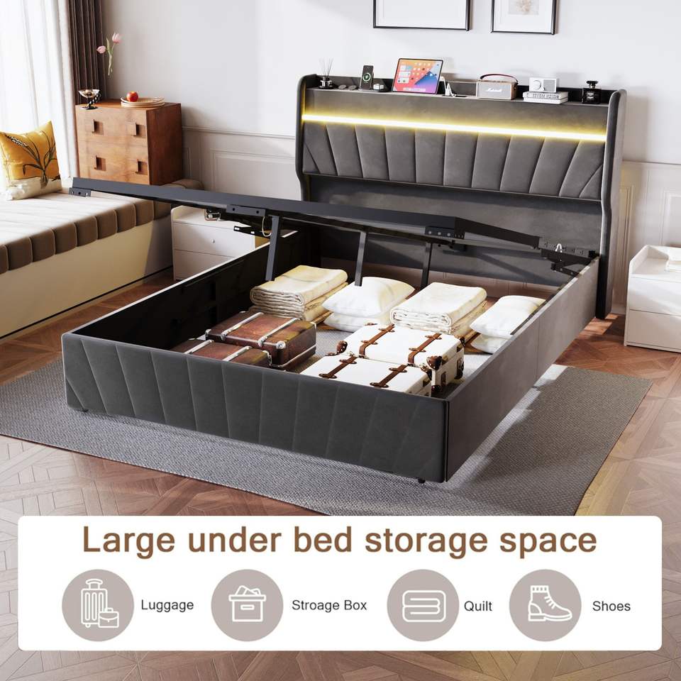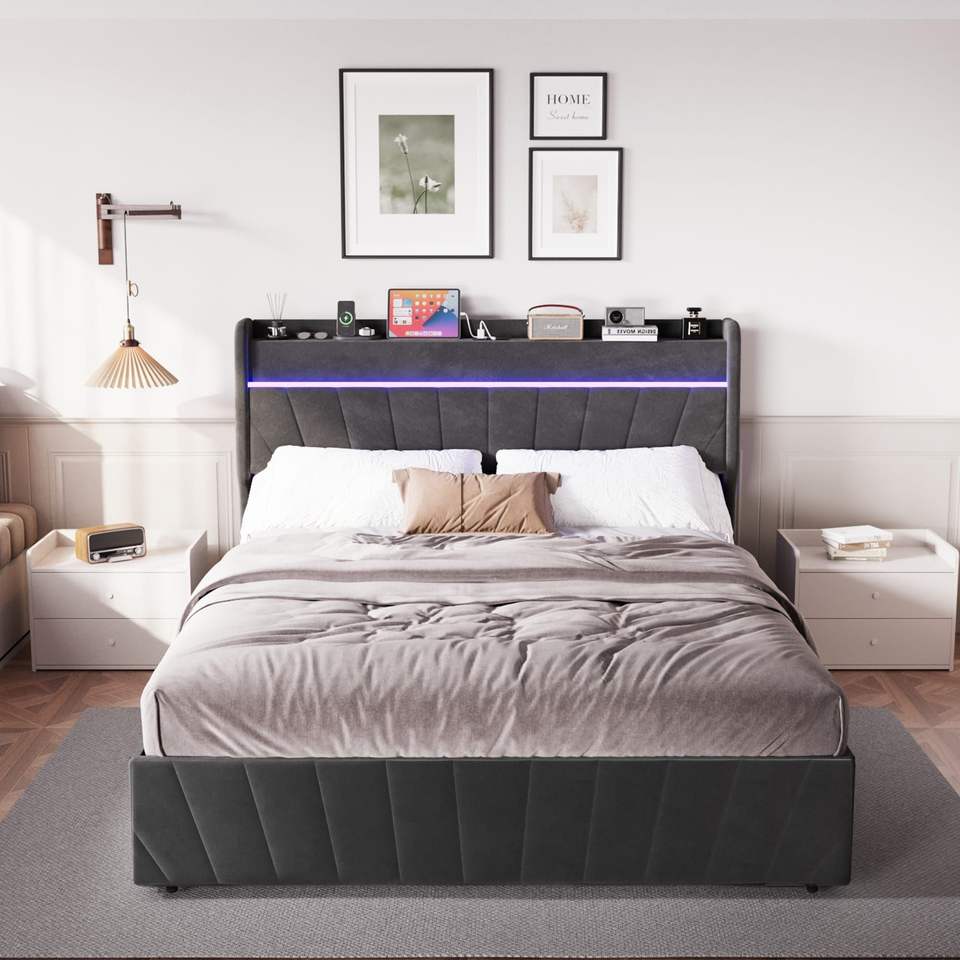 Letto matrimoniale imbottito con testiera a volant, piattaforma e stazione di ricarica LED, con contenitore e doghe in legno