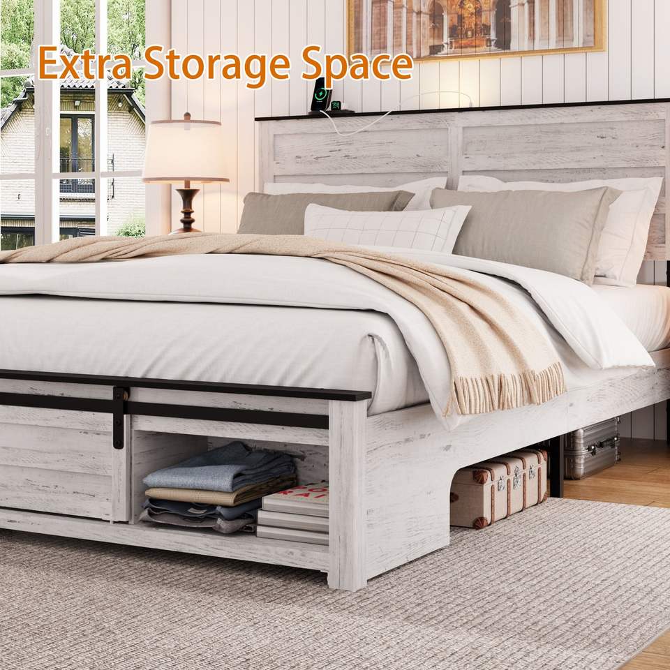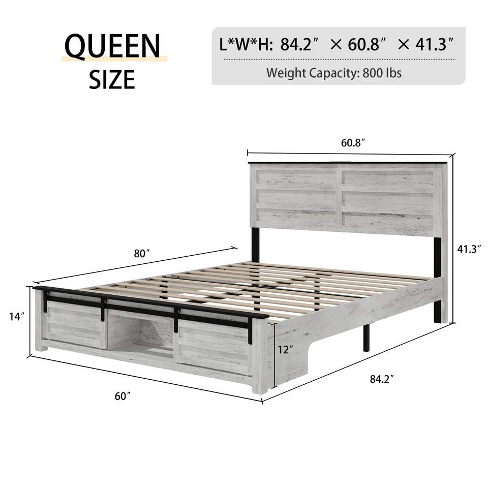 Letto matrimoniale Queen in legno con piattaforma, stazione di ricarica LED, testiera imbottita con contenitore, letti sollevabili in PE resistenti ed eleganti