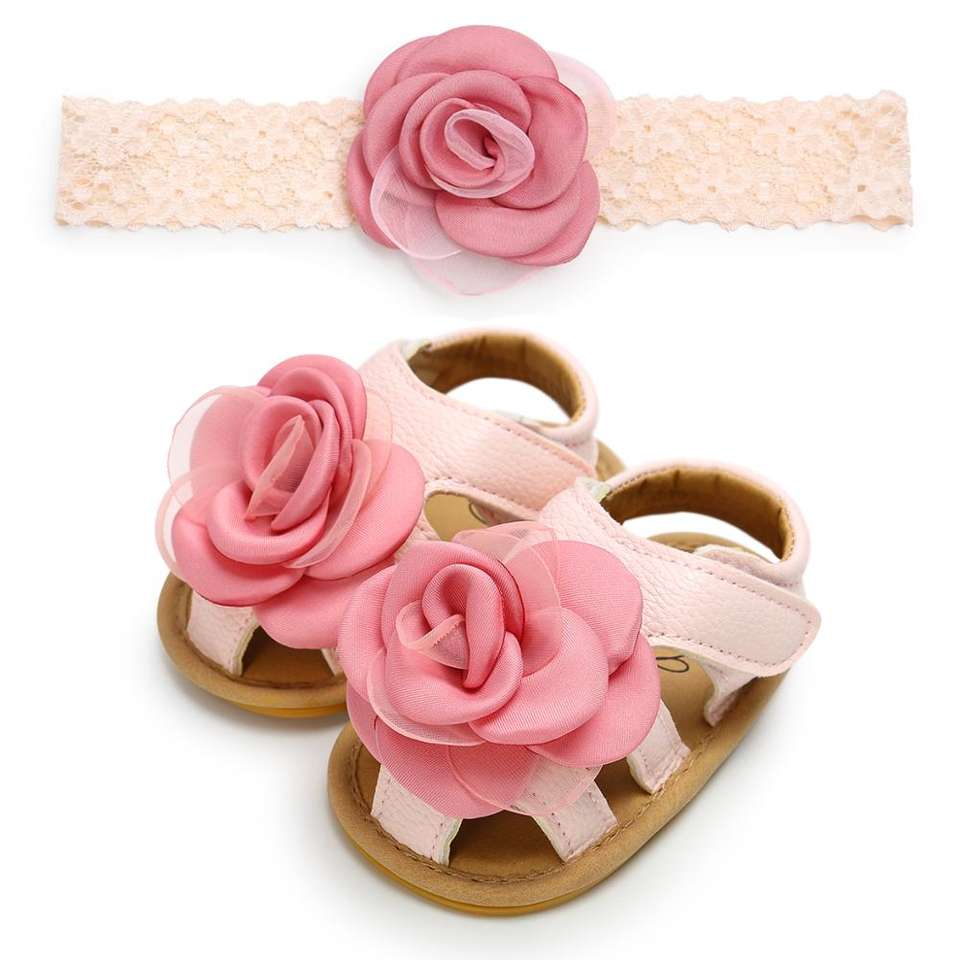 Sandali da bambina con suola morbida in gomma colorata con fiore in pelle PU di spedizione rapida con fascia per capelli