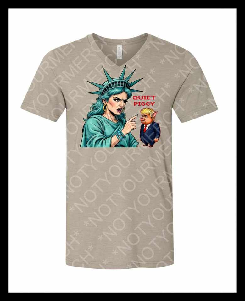 Quiet Piggy Liberty Edition Graphic T-Shirt Unisex V-Neck Short Sleeve Gray Tee Digital Print Promotional Apparel
