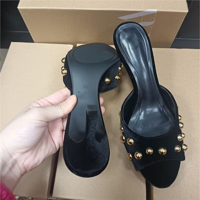 QuiteS 2026 Nuovi Sandali Neri in Camoscio con Borchie Metalliche, Tacco a Spillo, Punta Aperta, Suola in Gomma, Scarpe Casual Sexy per Donne