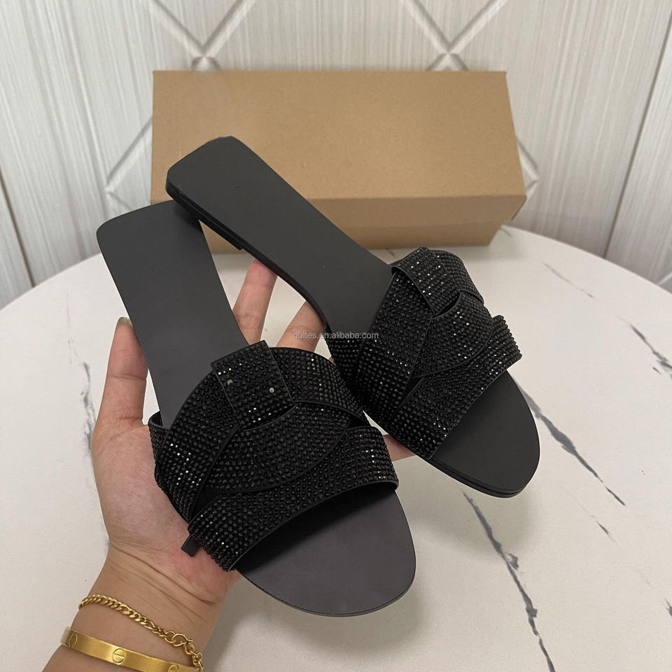 QuiteS Summer New Women's Shoes 2024 Gold Cross Flat Sandals Leisure Rhinestone Beach Flat Sandals