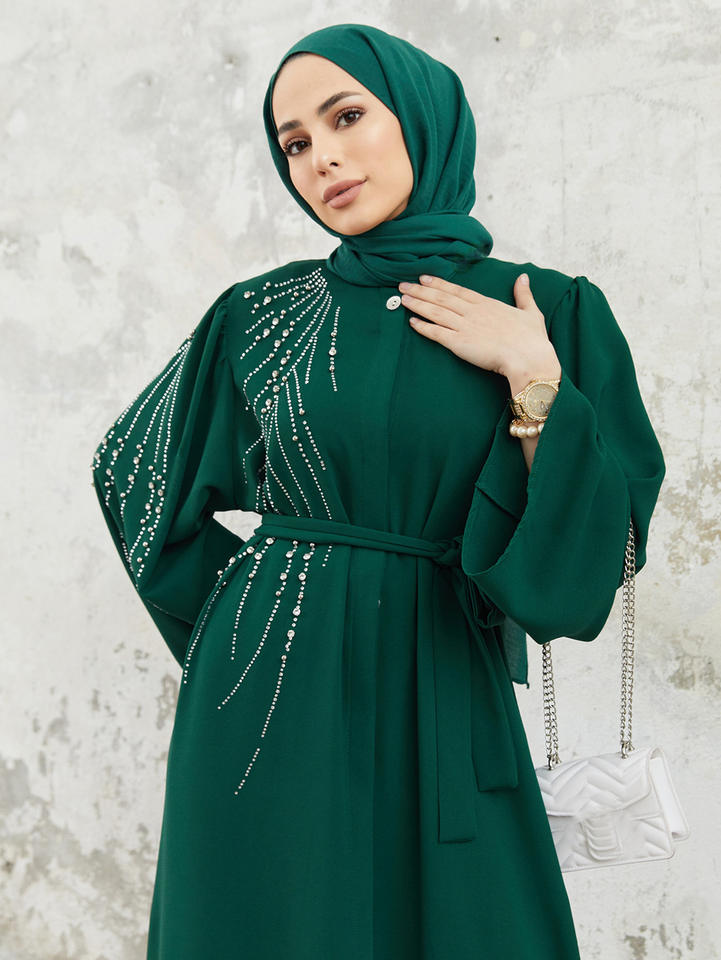 R-515 elegante abito da donna a manica lunga Ramadan con perline e perline strass musulmano modesto Abaya