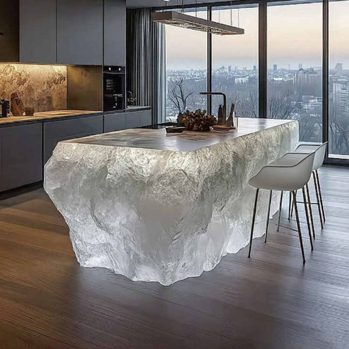 R039 Elegante Bancone Reception in Resina Epossidica con Luci LED, Tavolo da Caffè Trasparente con Linee Ondulate, Isola Bar Luminosa