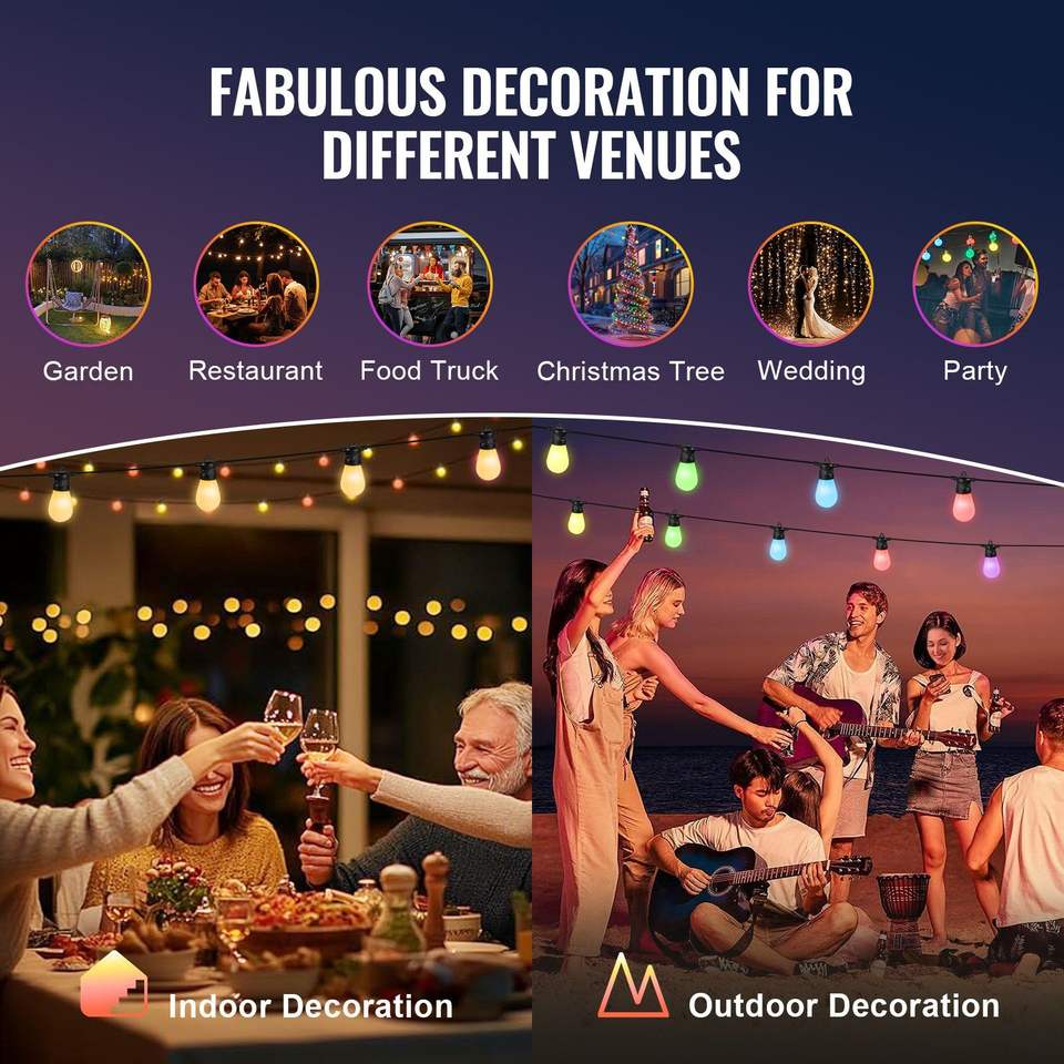 Luci a stringa LED RGB da esterno da 15 m per patio, controllo tramite APP, 15 lampadine con regolazione della luminosità a colore singolo e impostazione del timer