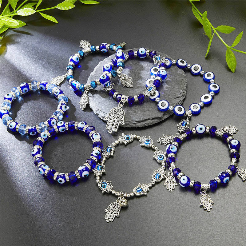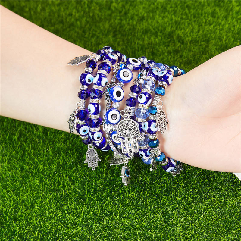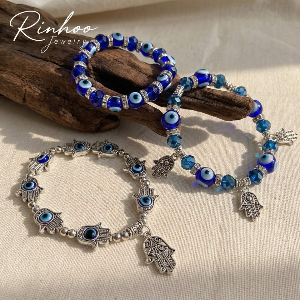RINHOO Braccialetto Trendy Turco con Amuleto Occhio di Allah Blu, Bracciali con Perline in Resina e Cristallo Mano di Fatima, Gioielli Portafortuna per Donna e Uomo