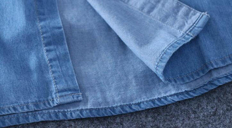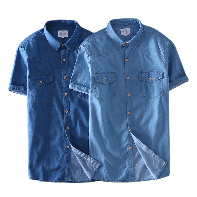 RNSHANGER Summer 100% Cotton Men Short Sleeved Denim Thin Shirt Soft Slim Jeans Solid Color Turn-down Collar Shirt With Pocket