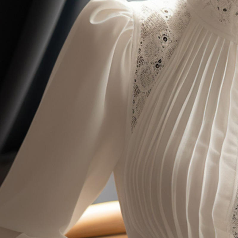 RNSHANGER White Women's Solid Color Blouses Fashion Stand Collar Commute Ruched Patchwork Lace Hollow Out Long Sleeve Shirt