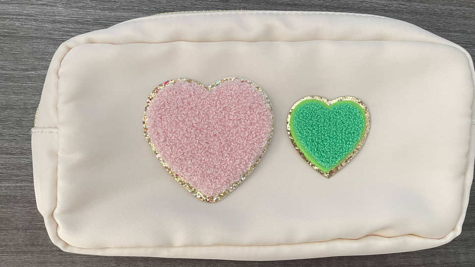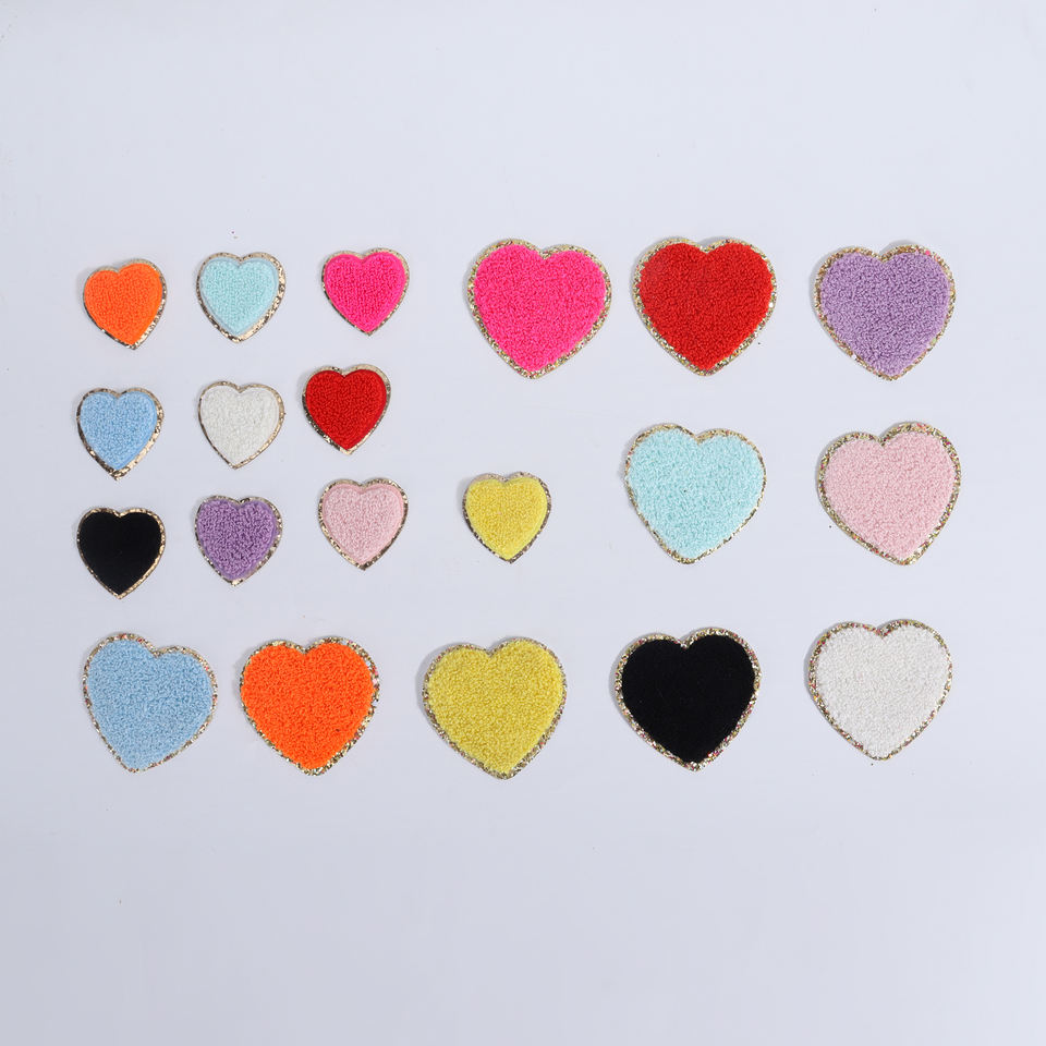 RTS fai da te Low Moq 2 taglie autoadesive Colorfu oro glitterato cuore cerotti asciugamano in ciniglia per borse indumento ciniglia cuore toppe