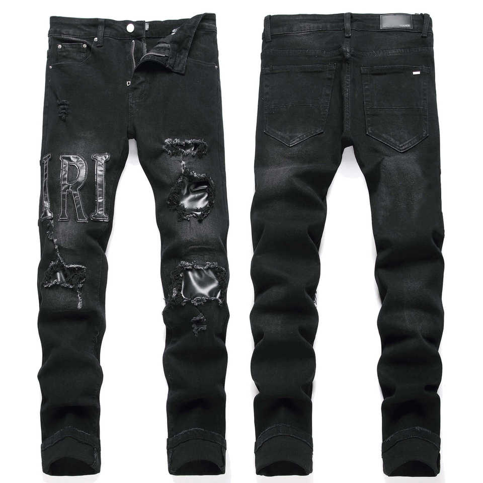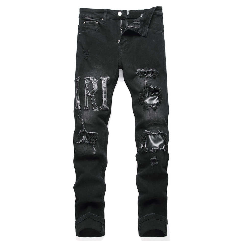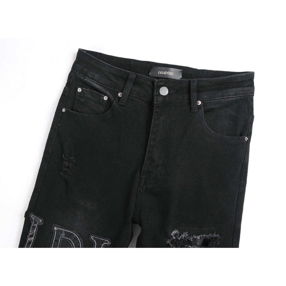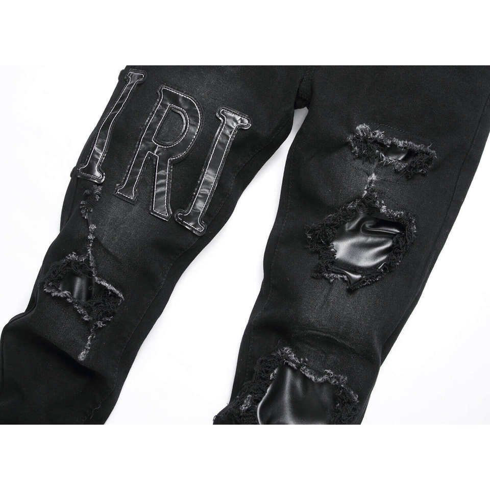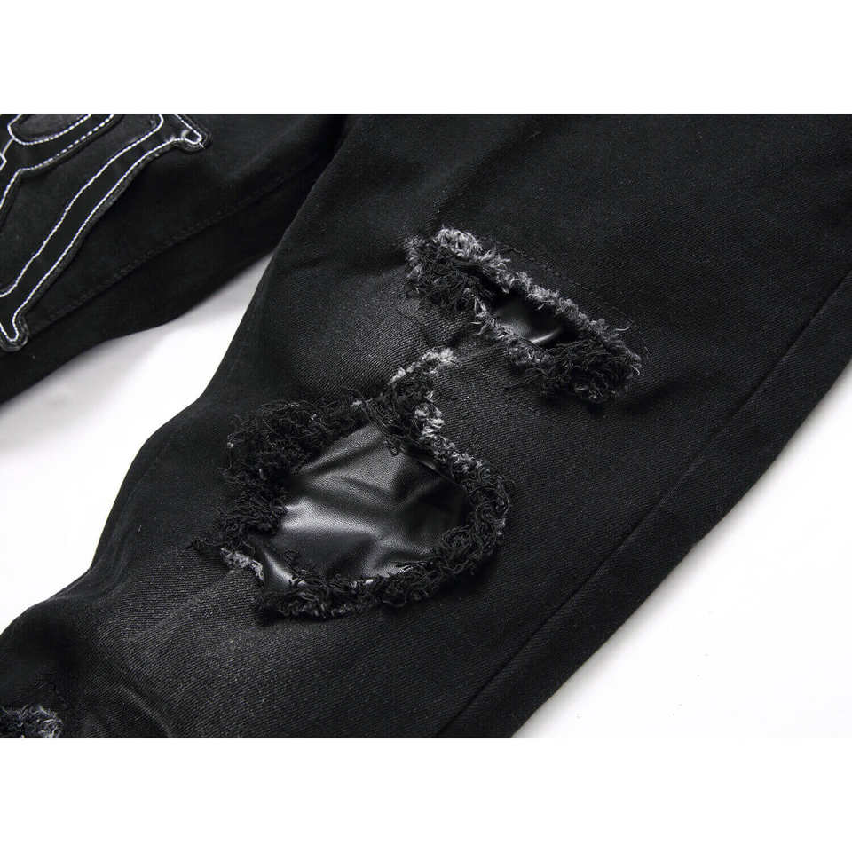 Jeans Neri Strappati da Uomo RUICHI, Moda Streetwear, Elasticizzati, Slim Fit, con Ricamo a Lettere
