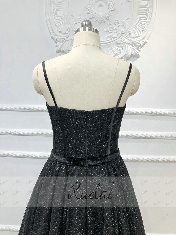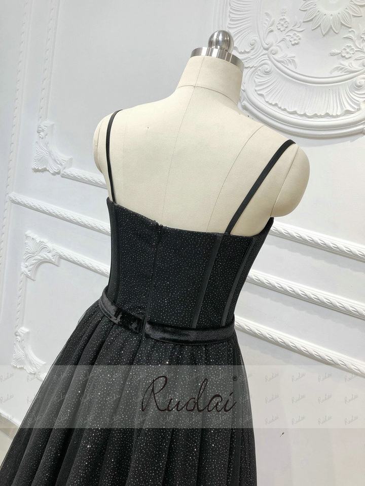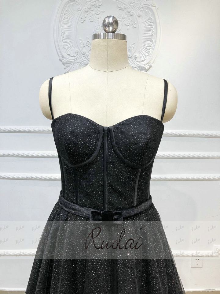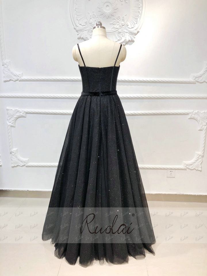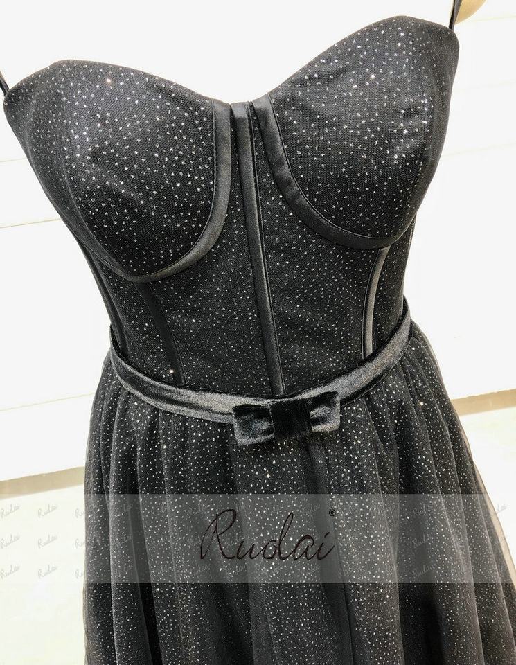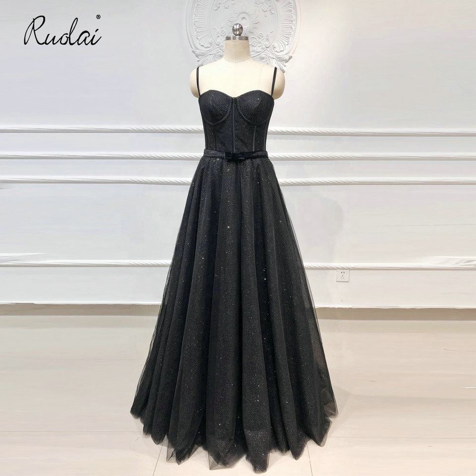 RUOLAI OEV-L4314 brillanti spalline con nastro Tulle abito da notte A-Line nero abiti da sera lunghi