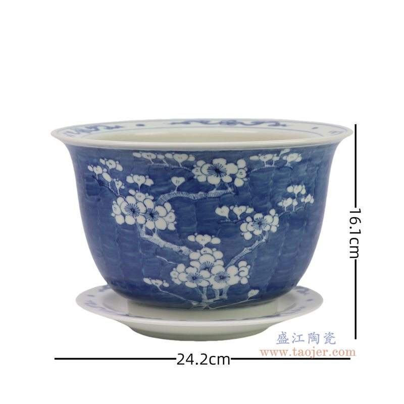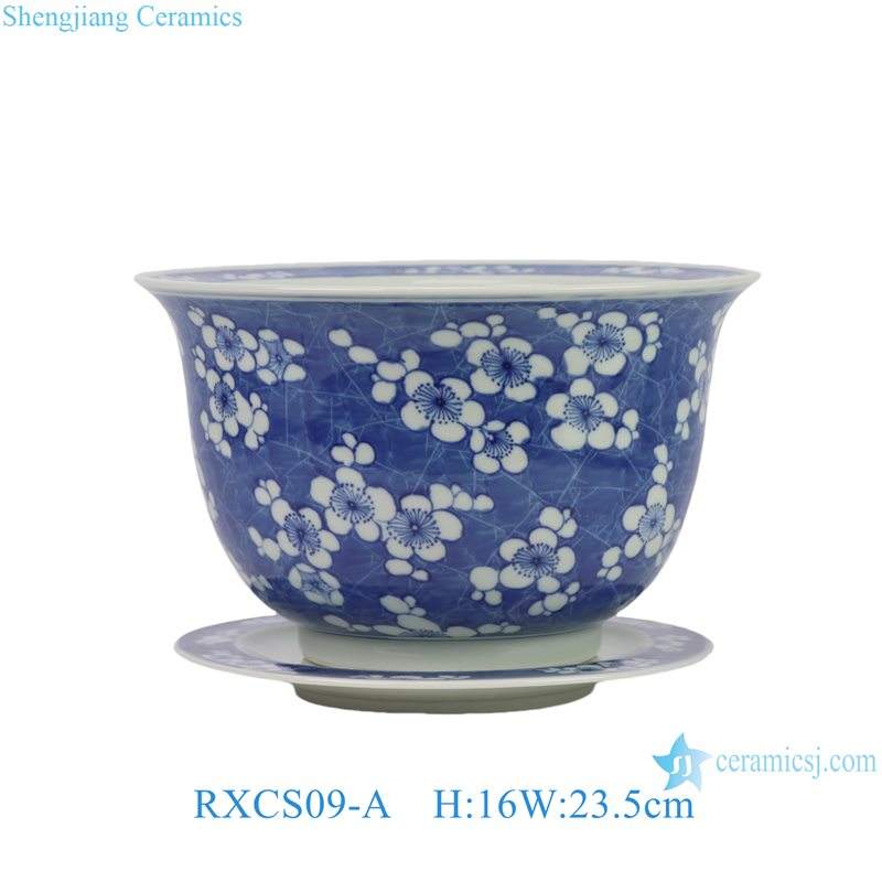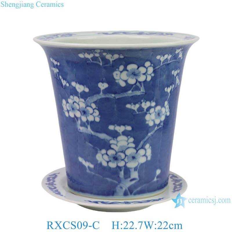 RXCS09-A-B-C Dark Blue Color Glazed White Ice plum Blossom Pattern Handpainted Small Size Ceramic Planter Pot with Saucer