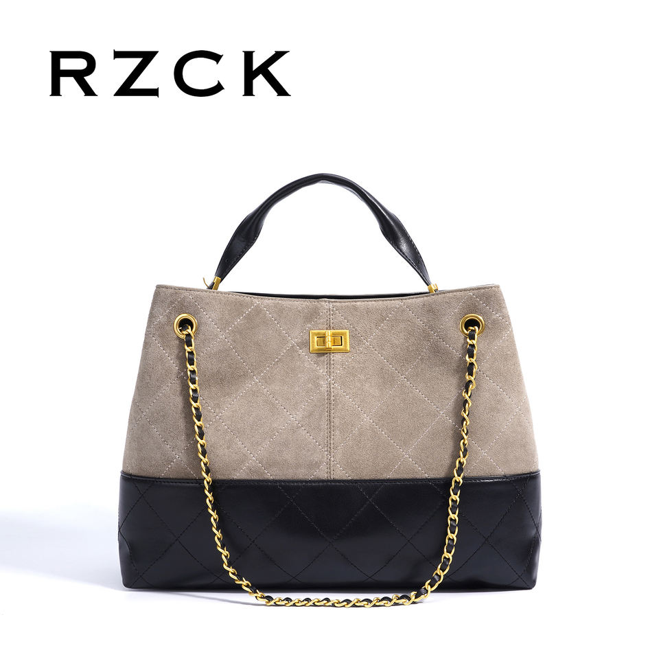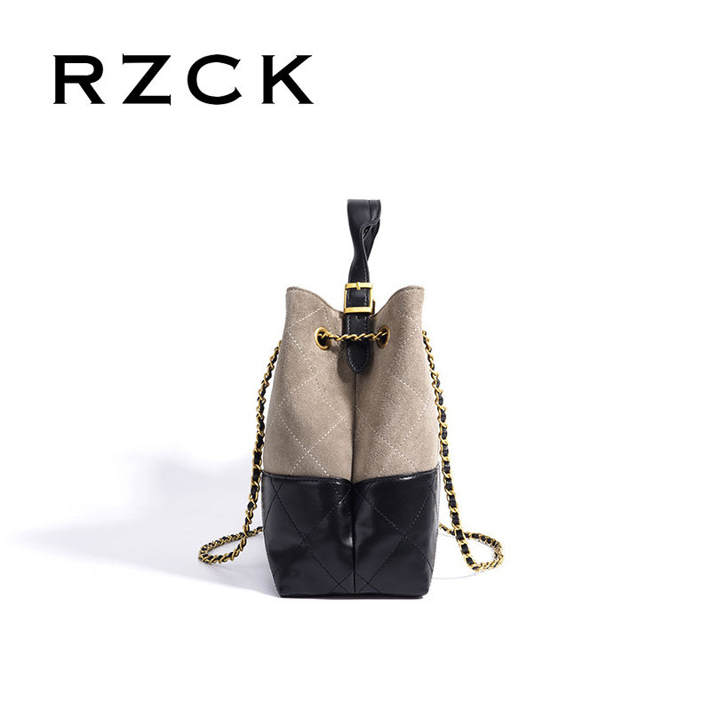 RZCK Autumn Retro Luxury Women PU Leather Handbag Geometric Large Bucket Quilted Tote Bag Chains Casual Stylish Suede Design Bag