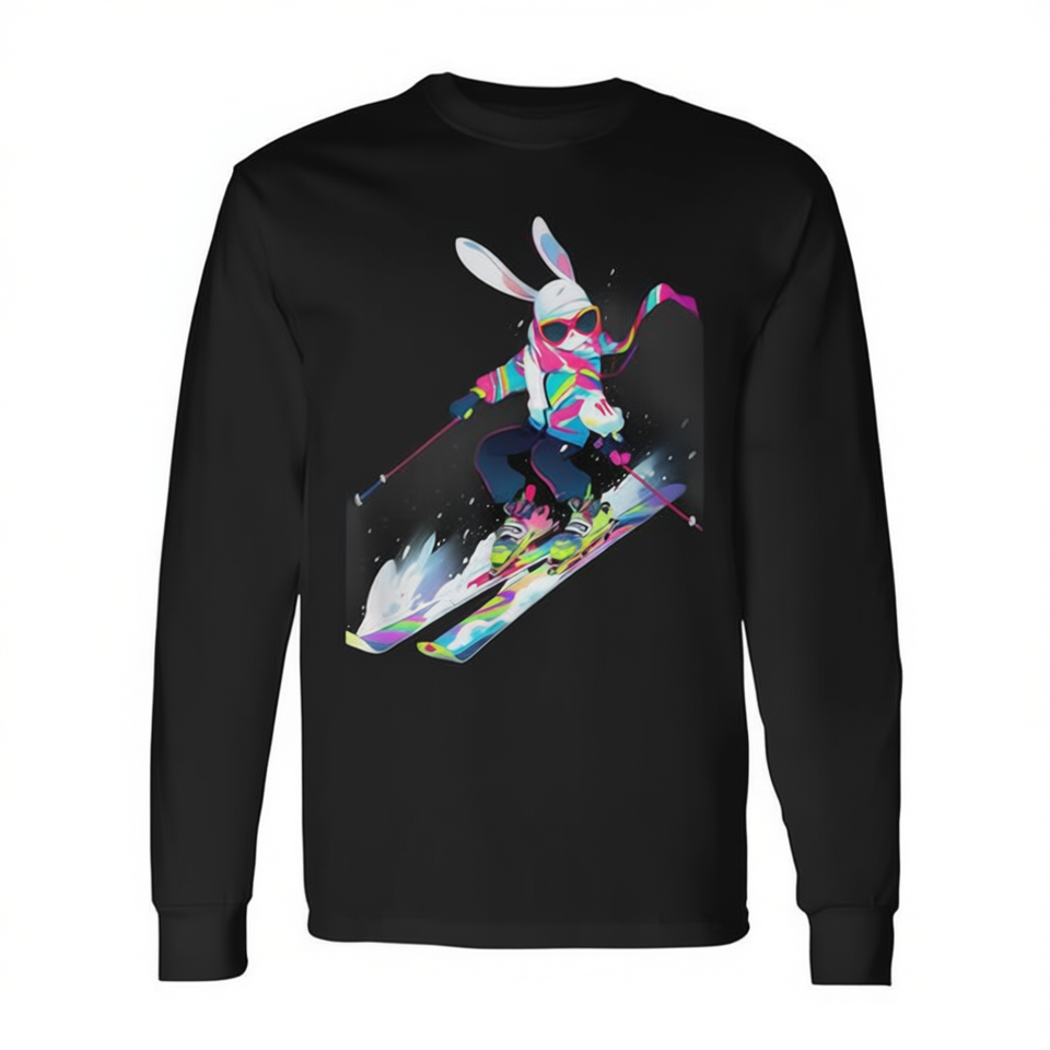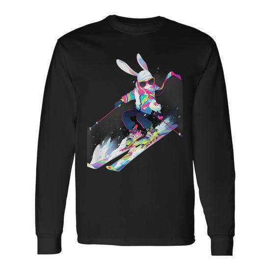 T-shirt a maniche lunghe con stampa coniglio sciatore invernale sulla neve