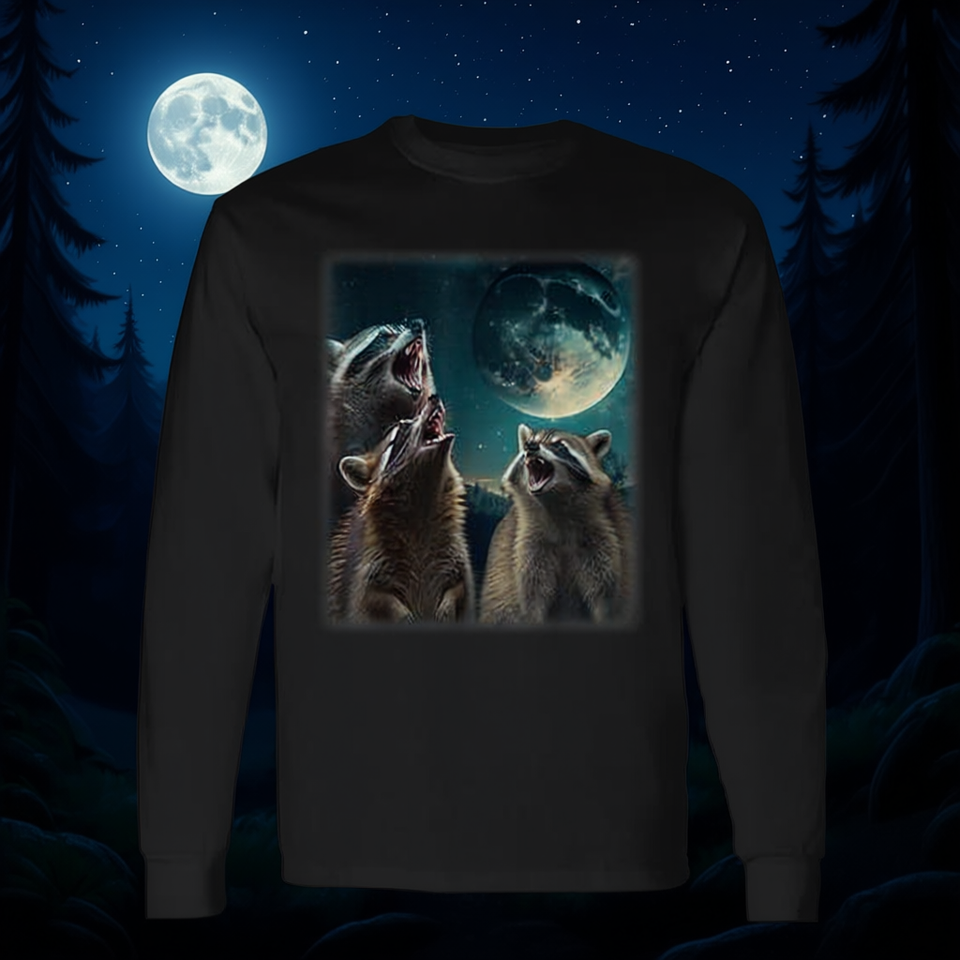 T-shirt a maniche lunghe con tre procioni che urlano sotto la luna
