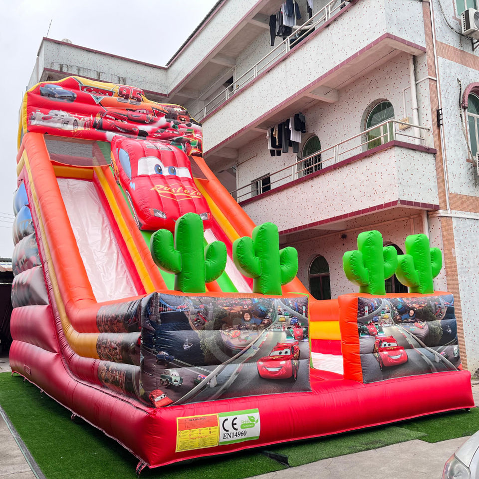 Gonfiabile a tema auto da corsa con scivolo a secco e area salti