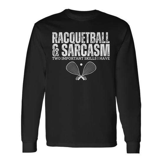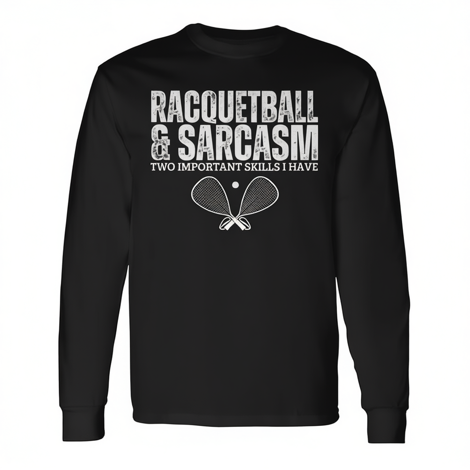T-shirt a maniche lunghe Racquetball And Sarcasm, girocollo unisex, per adulti, sport e giochi, stampa serigrafica