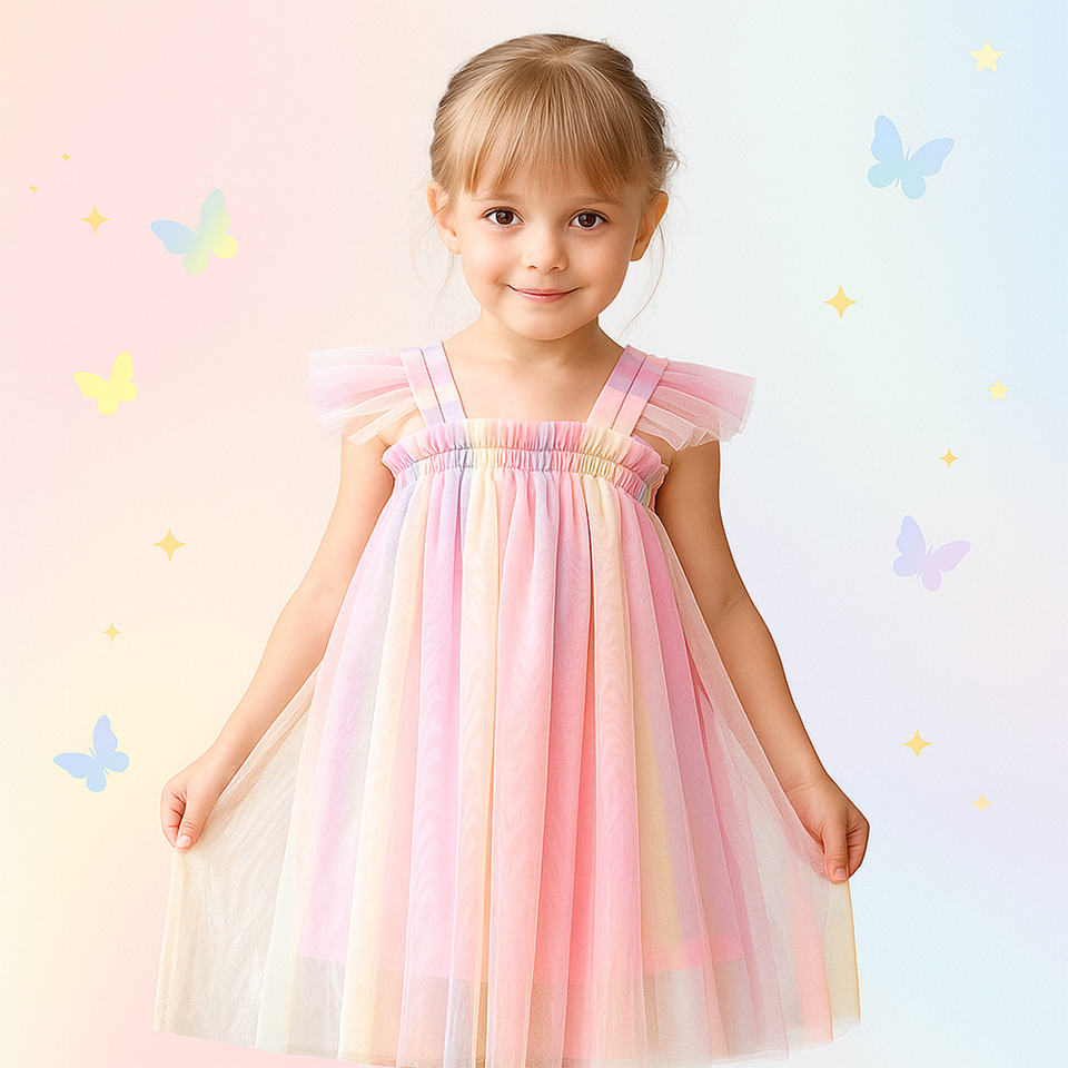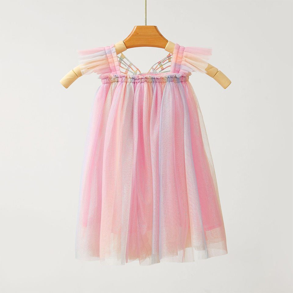 Rainbow Tulle Princess Dress Kids Summer Party Outfit Sleeveless Sundress with Bowknot for Girls