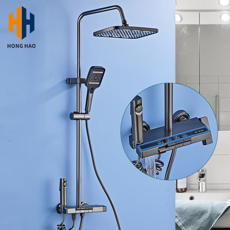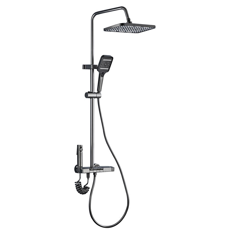 Set Doccia a Cascata con Finitura Spazzolata, Miscelatore Intelligente per Bagno con Acqua Calda e Fredda, Rubinetto a Cascata con Barra Scorrevole e Soffione Doccia