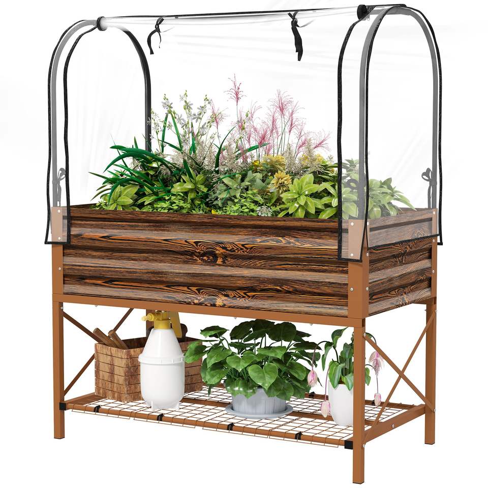 Fioriera Rialzata in Metallo con Gambe e Copertura, Vaso Rialzato con Ripiano Inferiore e Rivestimento per Ortaggi, Marrone