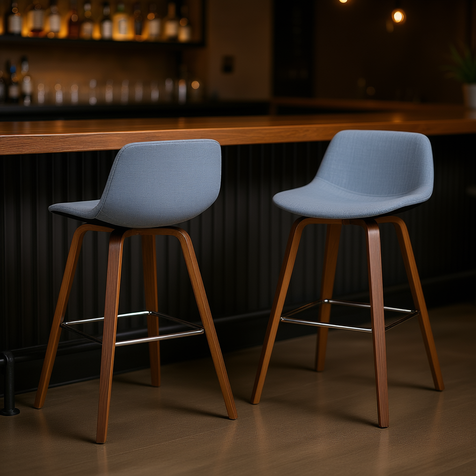 Set di 2 sgabelli da bar Randolph, base in legno grigio denim, mobili commerciali moderni in stile Mid-Century