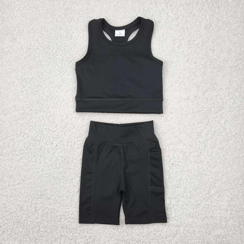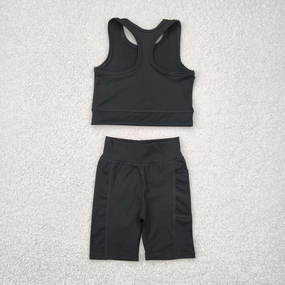 Pronto per la spedizione in Stock per bambini ragazze abbigliamento attivo estate nero tinta unita canotta abbinata pantaloncini da Yoga atletico