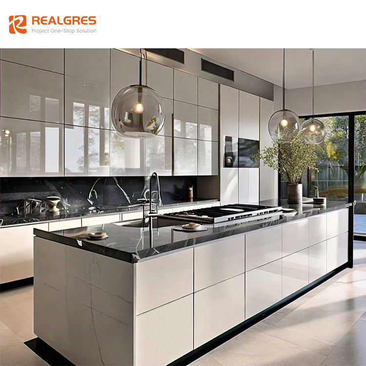 Realgres impermeabile Rta Interior Design personalizzato in legno massello di lusso Beige alto lucido moderno modulare armadi da cucina a buon mercato prezzo