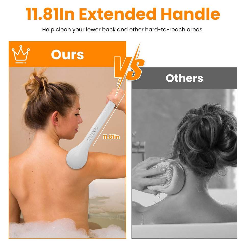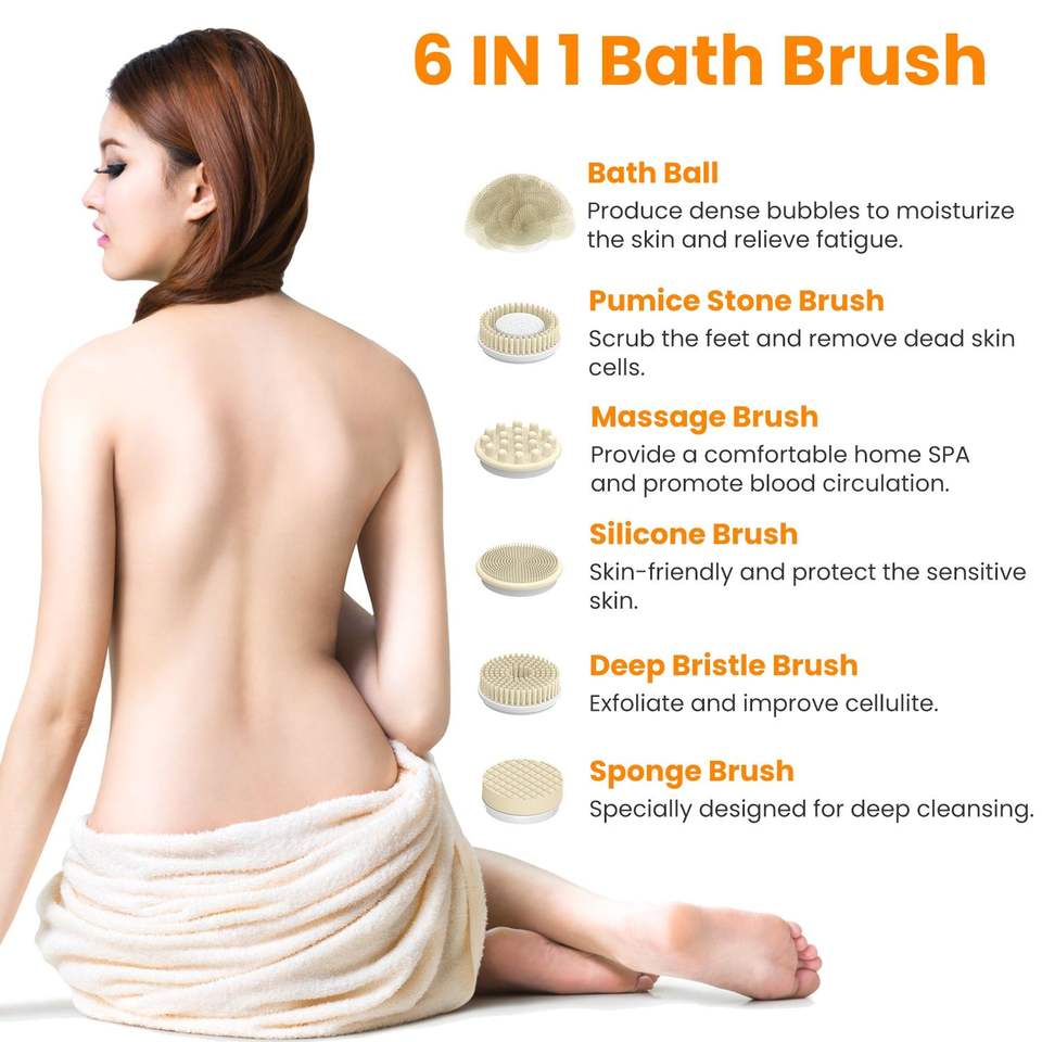 White Rechargeable Electric Bath Brush 6 Shower Brush Heads 3 Rotating Modes Body Scrubber Massaging Spin Extended Exfoliating