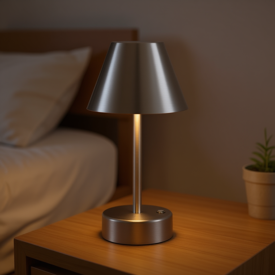 Lampada da Tavolo LED Ricaricabile in Nichel Spazzolato con Interruttore Touch, Luce Minimalista per Camera da Letto, Paralume in Metallo, Corpo in Ferro