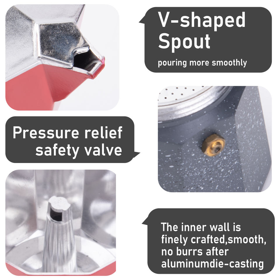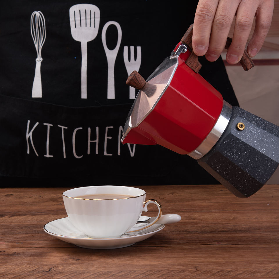 Caffettiera Moka Rossa in Alluminio con Manico in Legno, per Espresso da Fornello, con Valvola di Sicurezza per il Rilascio della Pressione