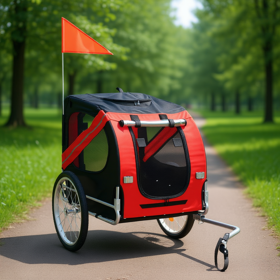 Rimorchio per bici per animali domestici rosso e nero con bandiera per avventure all'aperto
