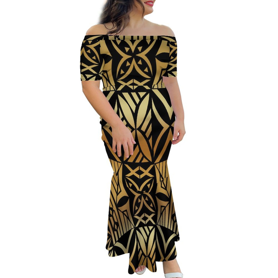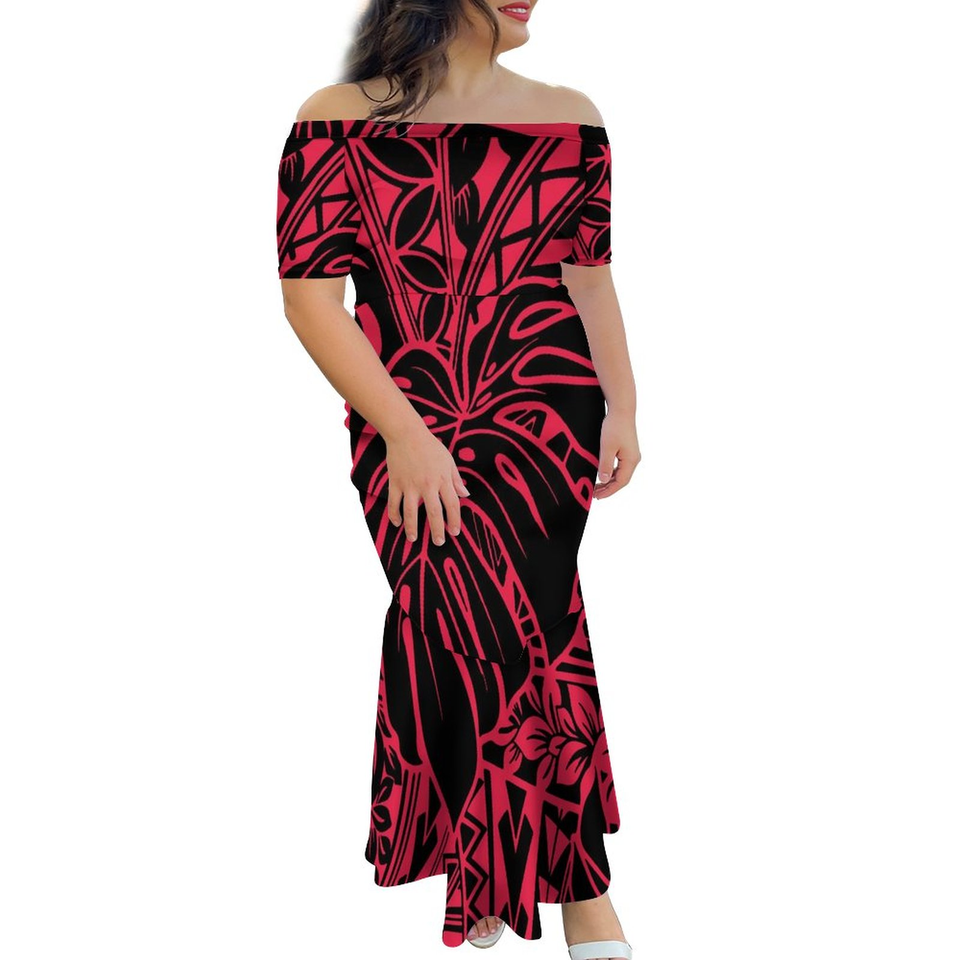 Red Big People Customized on Demand Half Shoulder Fishtail Dress Tongan Style Polynesian Pacific Island Art One Shoulder Dress