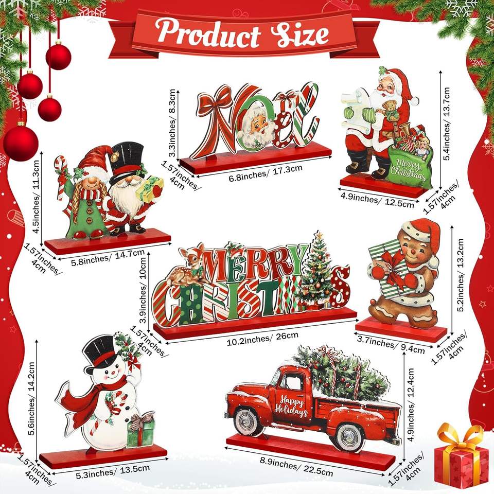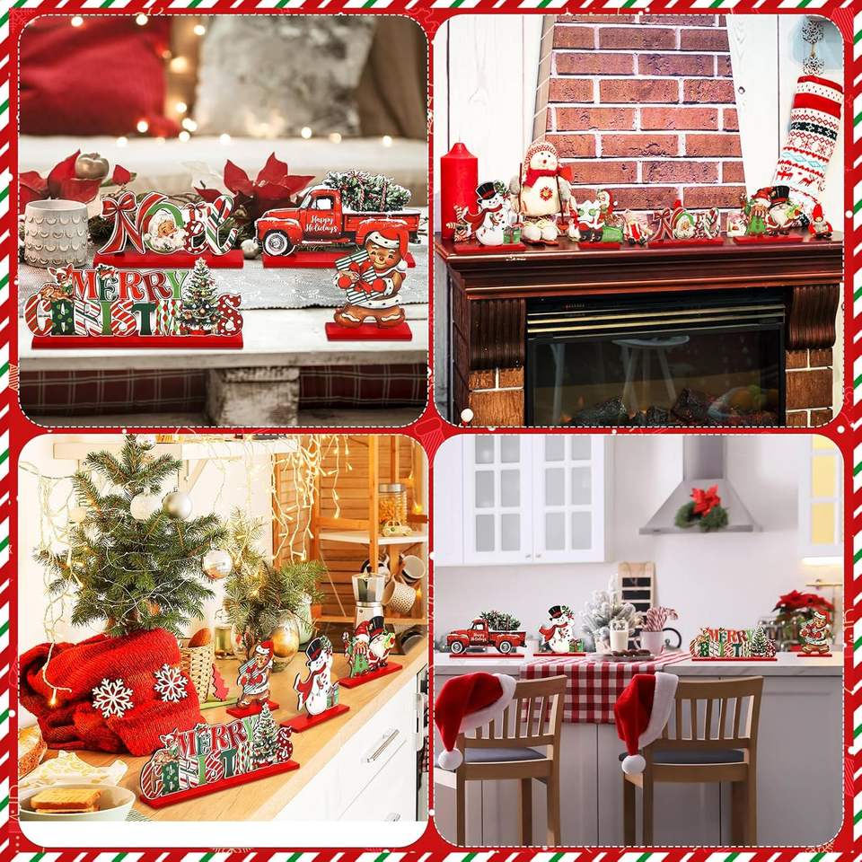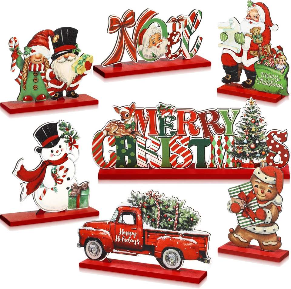 Decorazioni Natalizie da Tavola Rosse, Centrotavola Vintage in Legno Retrò per Feste di Natale, Babbo Natale e Gnomi in Stile Antico
