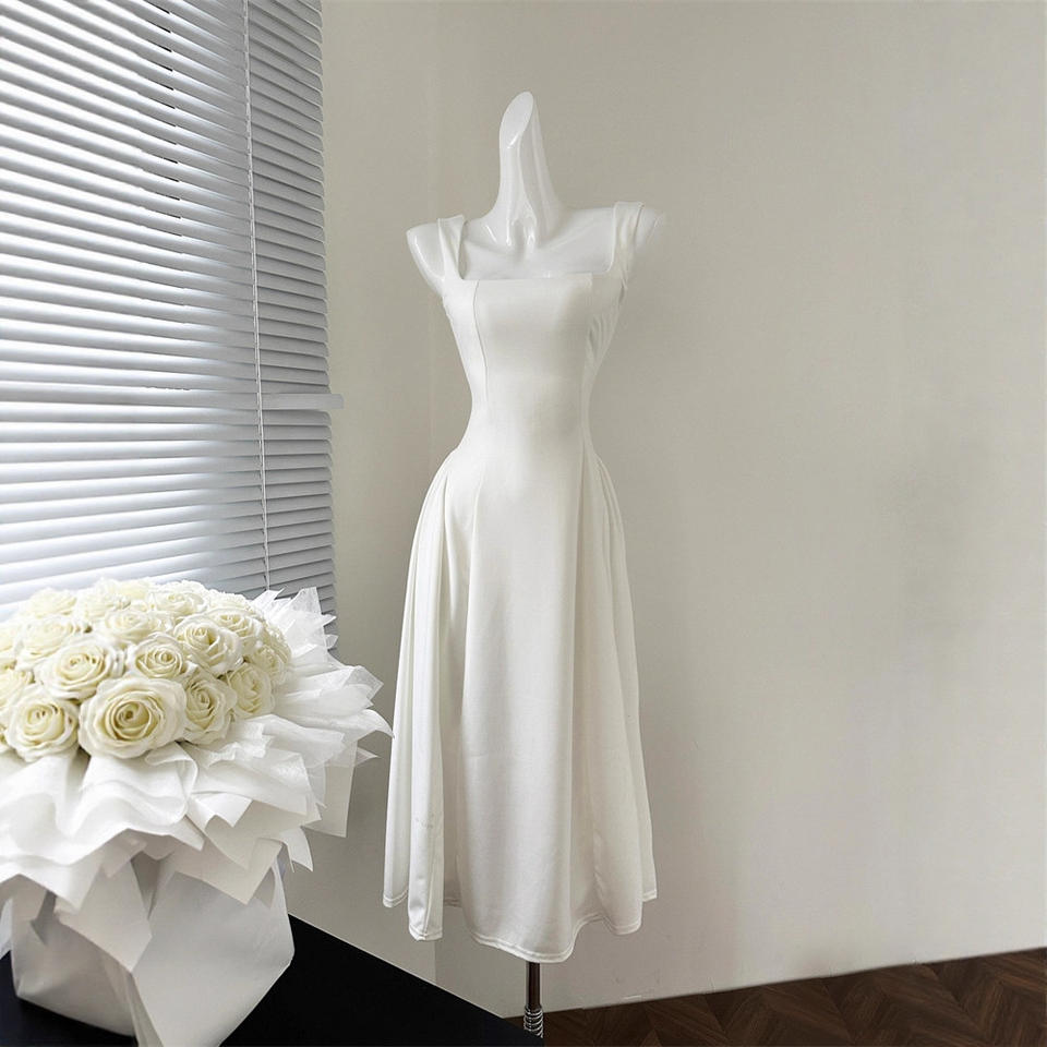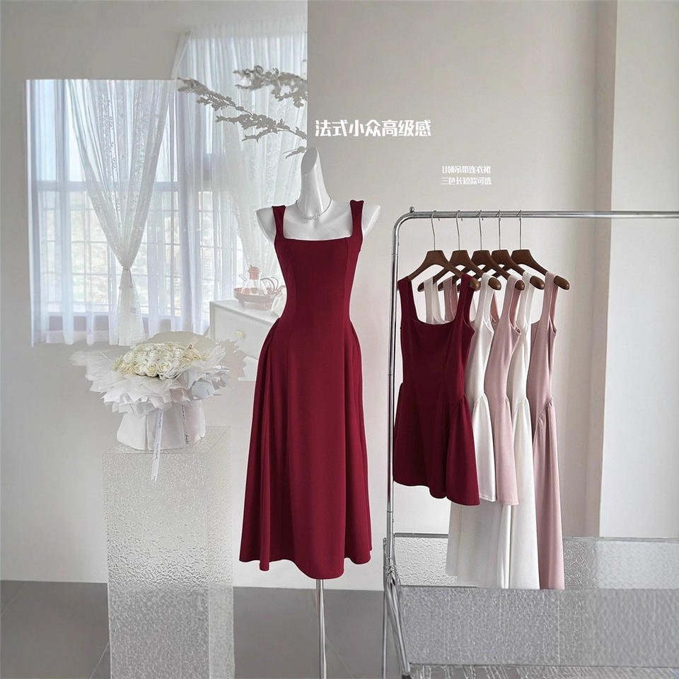 Red O-Neck Strap Vintage Anti-Static A-Line Skirt Dress for Women 2024 New French Style Niche High-End Long
