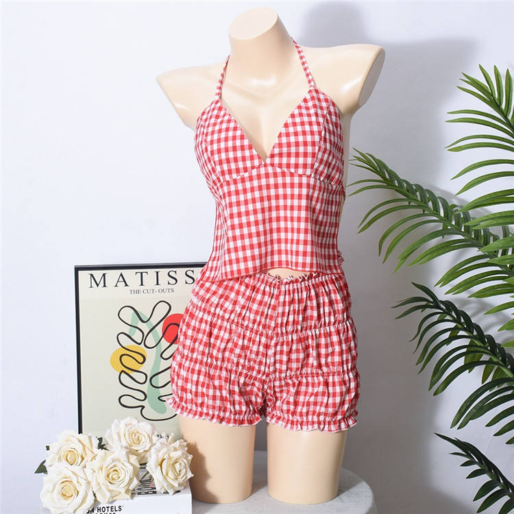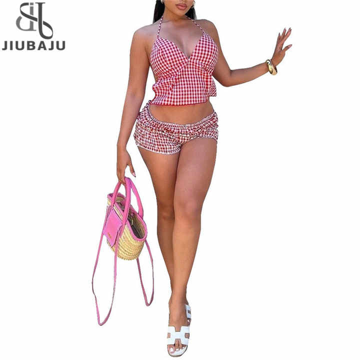 Set Plaid rosso in due pezzi per donna canotta e pantaloncini a vita bassa abiti per le vacanze estive Y2k