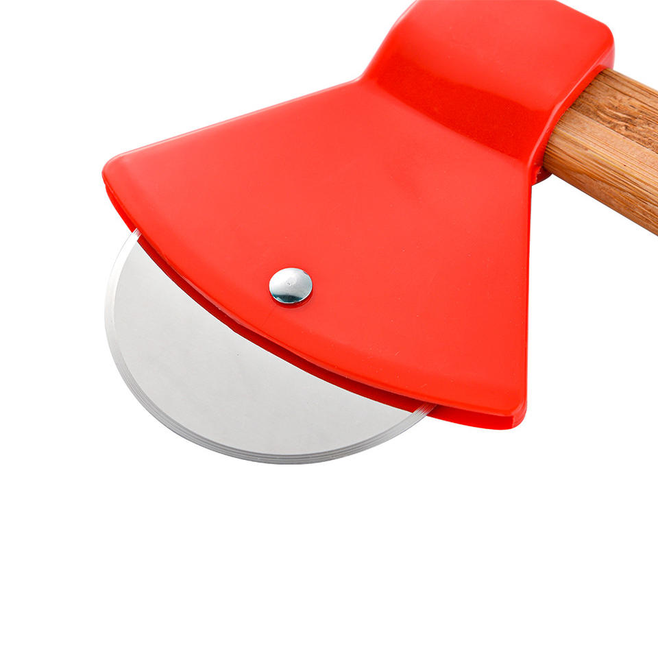 Rotella Tagliapizza Rossa a Forma di Ascia in Plastica con Manico in Bambù Resistente, Accessorio da Cucina per Uso Domestico