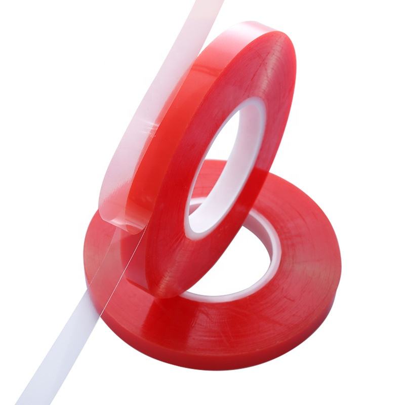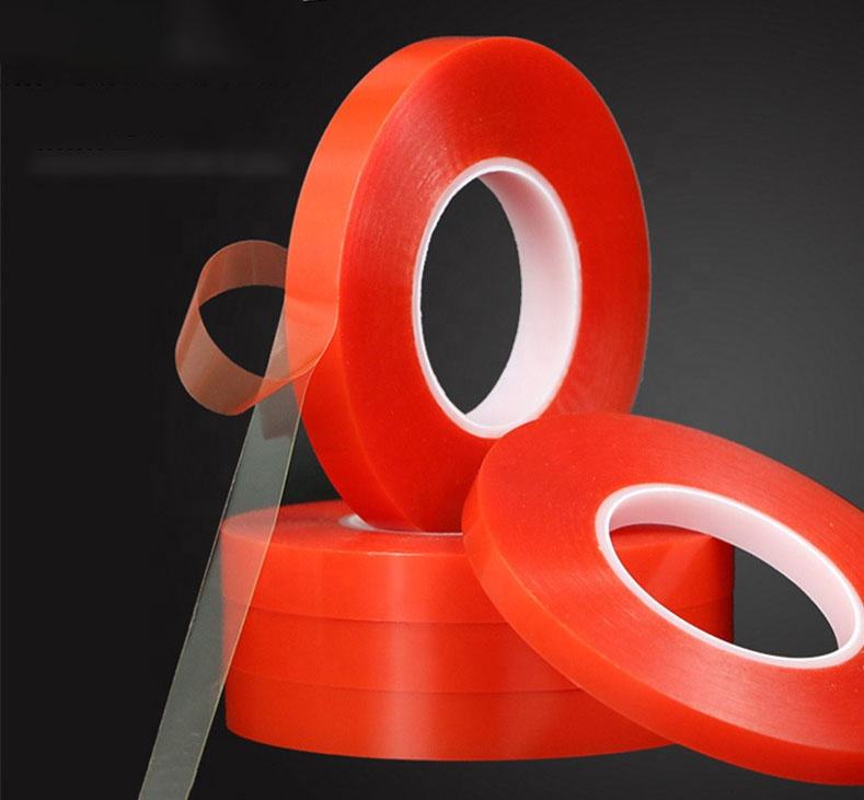 Nastro Biadesivo in PET con Adesivo Solvente Super Forte e Trasparente con Liner Rosso